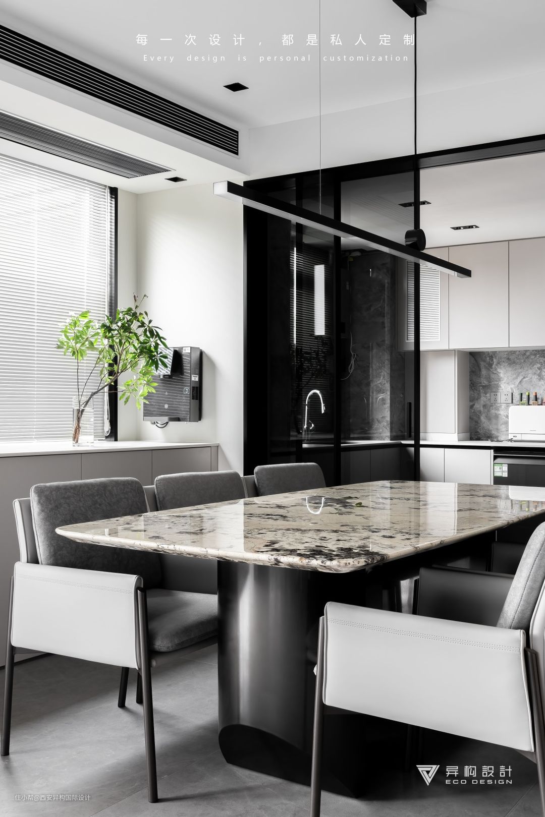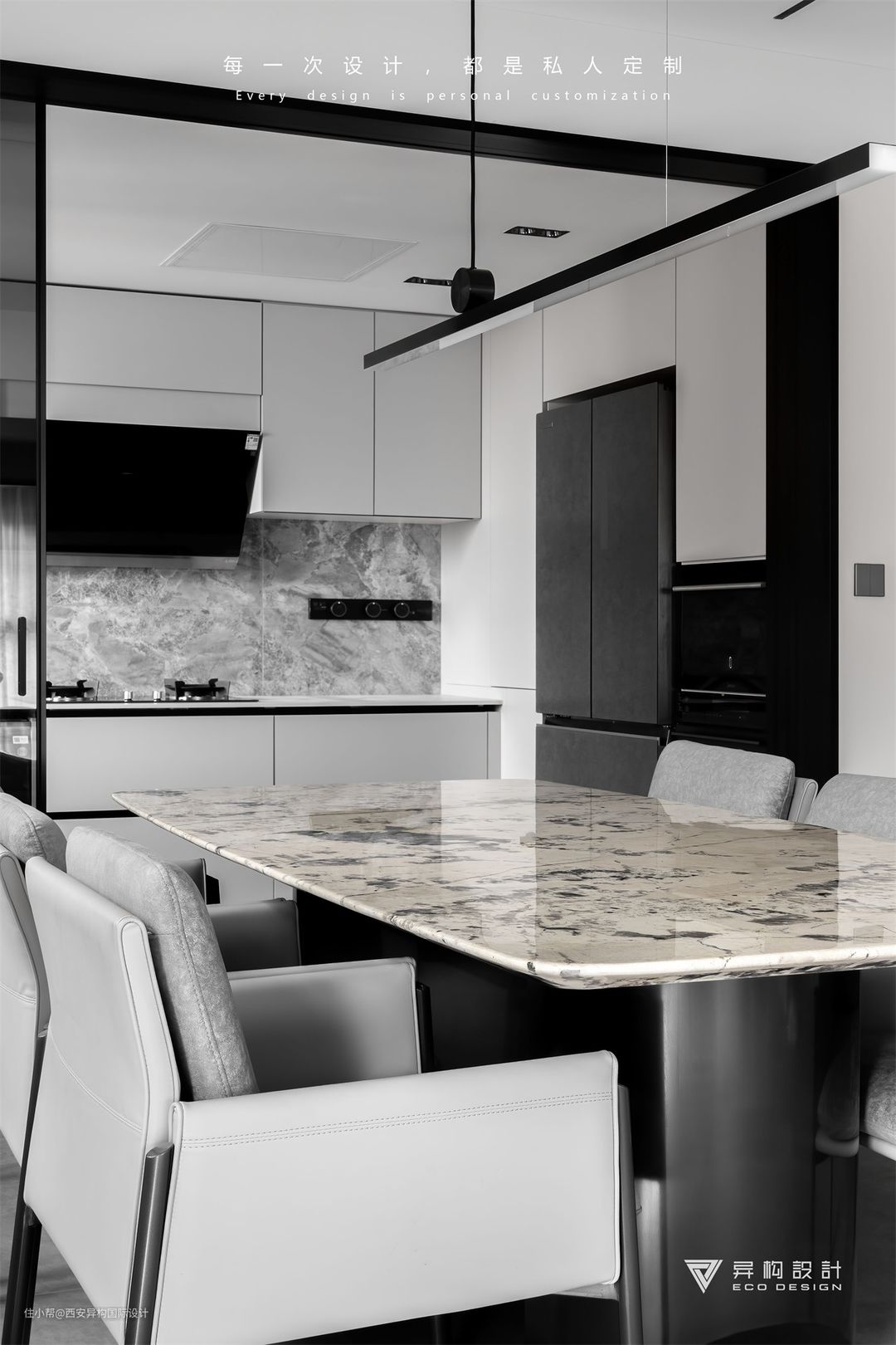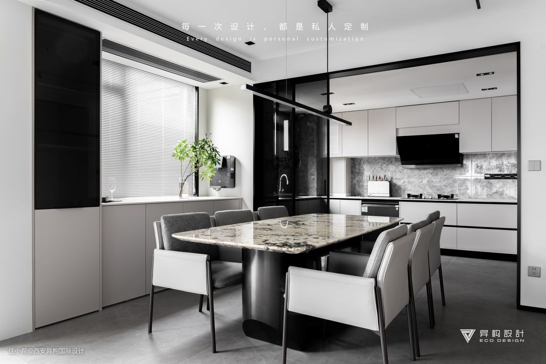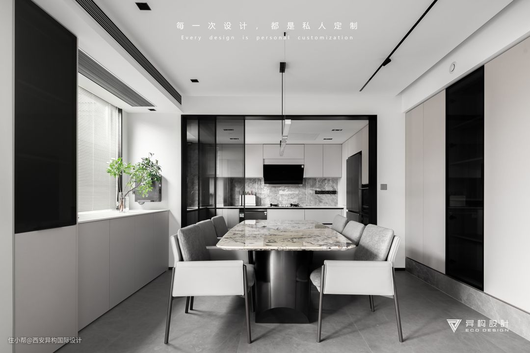 餐厅是生活中最重要的地方之一,除了美观,在功能使用上需要着重考虑。两侧分别做了一组餐边柜,满足日常收纳,米白和黑玻的柜门搭配,保证了视线的秩序感。