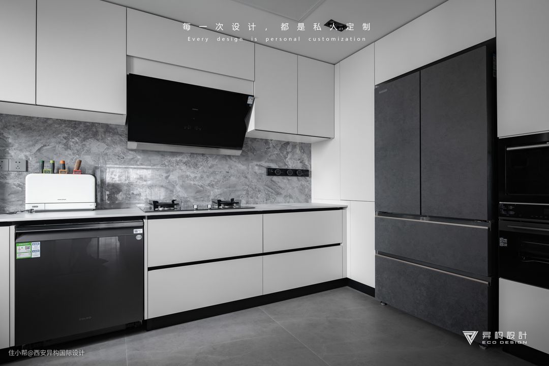 填补门洞后的厨房,空间利用率更高,冰箱和蒸烤箱也有了落脚位置。整体功能划分明确,实用简单,色彩搭配上素雅且高级。