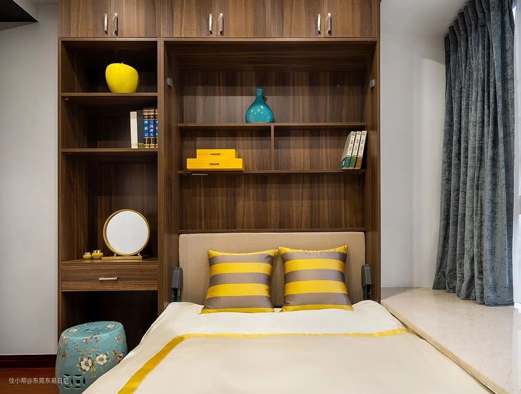 触顶的柜式设计,将收纳功能给完全利用起来,而圆形的化妆镜和老式风格的化妆凳将我们带进明清时期的氛围,新中式风格的设计完美的将传统融入到现代化的框架中,也给人一种轻盈混搭风的效果。