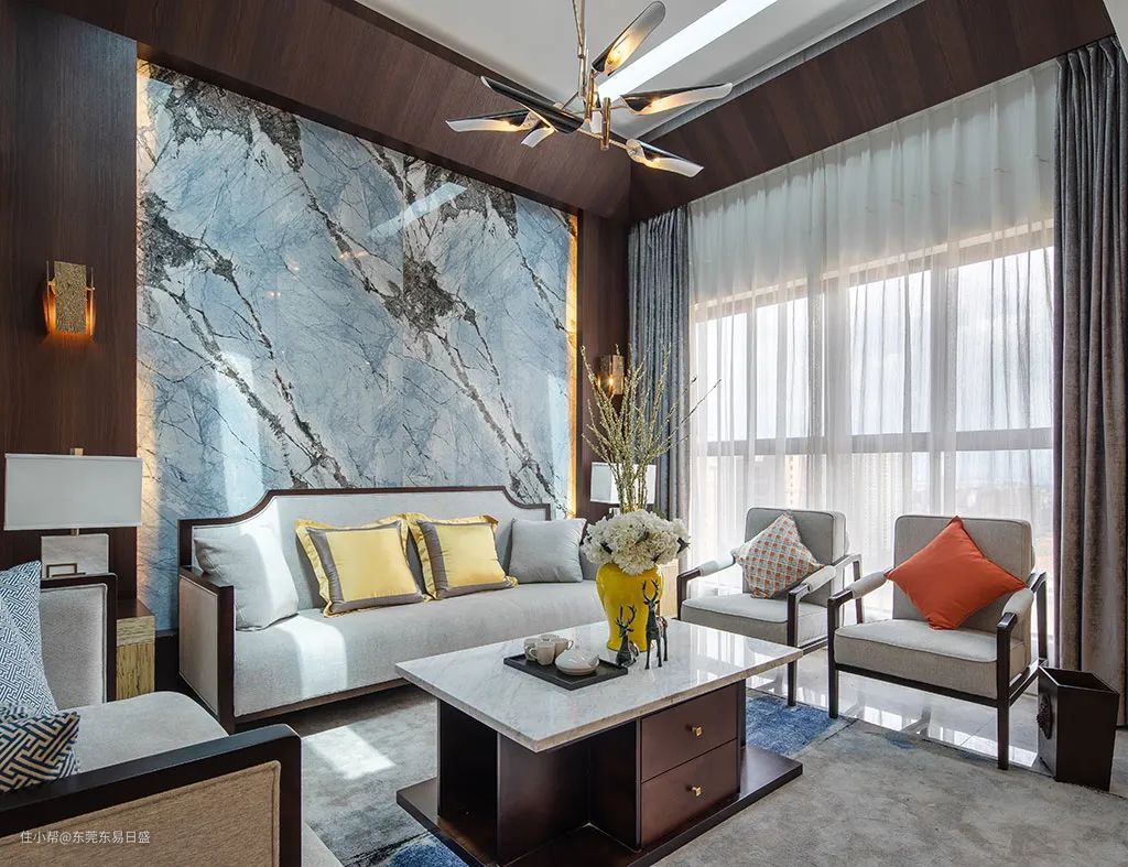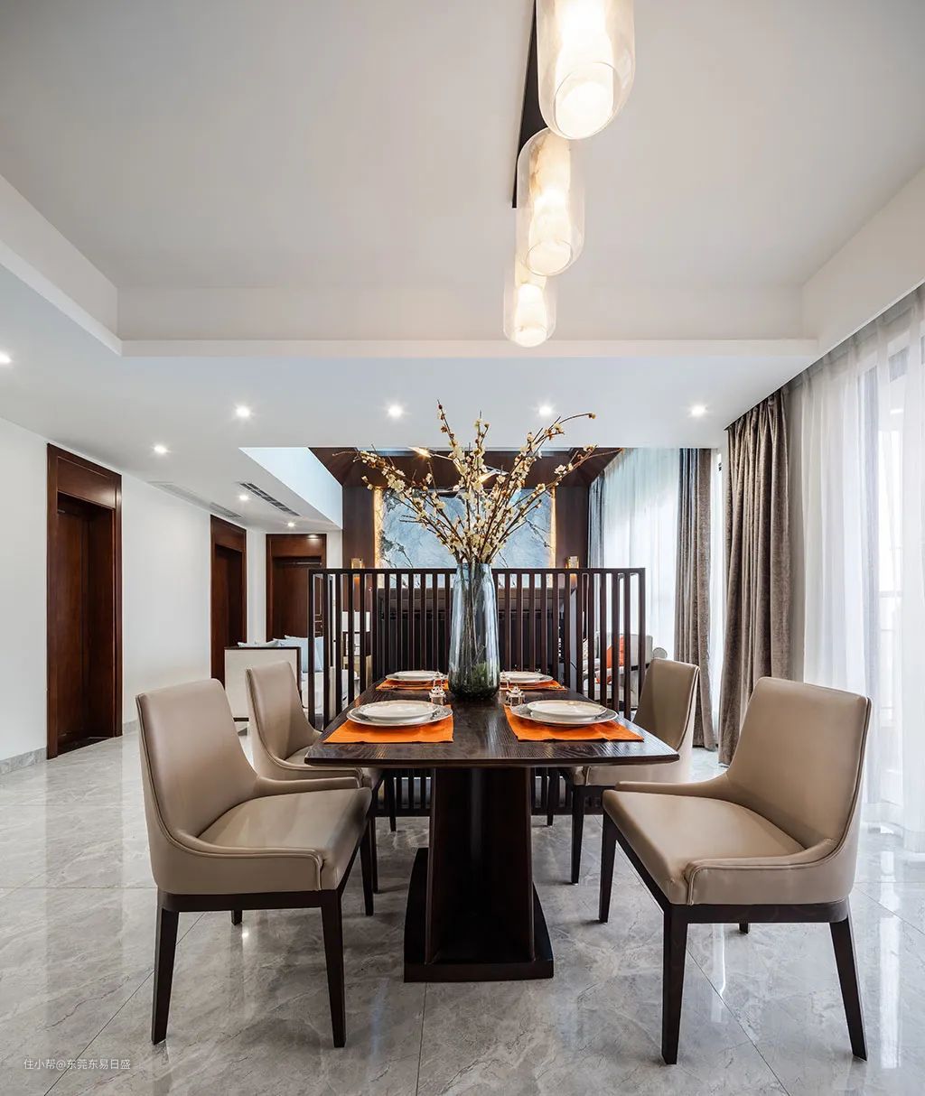 新中式的屏风设计依旧沿用传统的风格布施,但无不彰显本案的轻奢风格,而对称的结构也是此风格的特色,从客厅延生到餐厅的瓷砖将整体的效果体现的很自然,简洁大方的效果呈现。