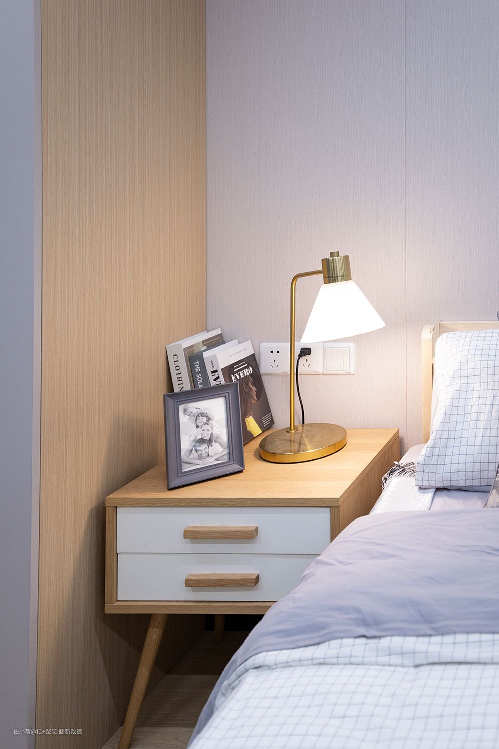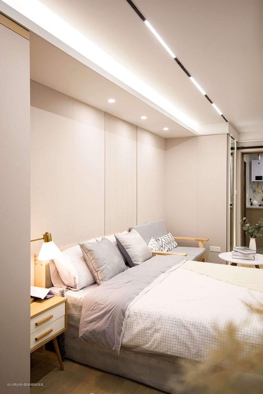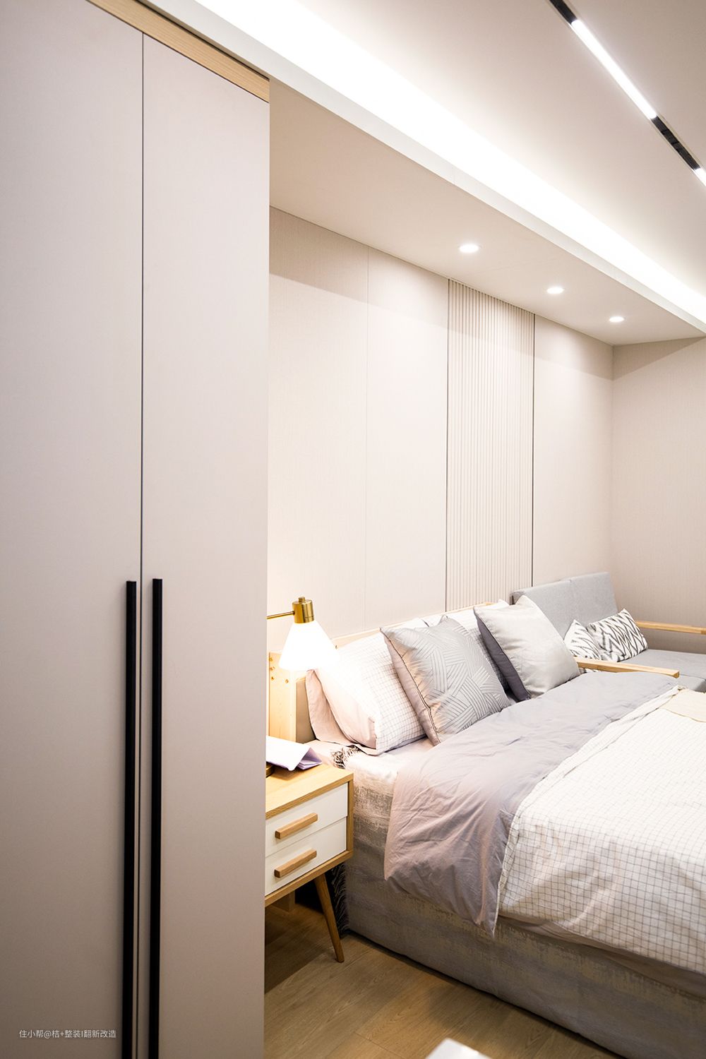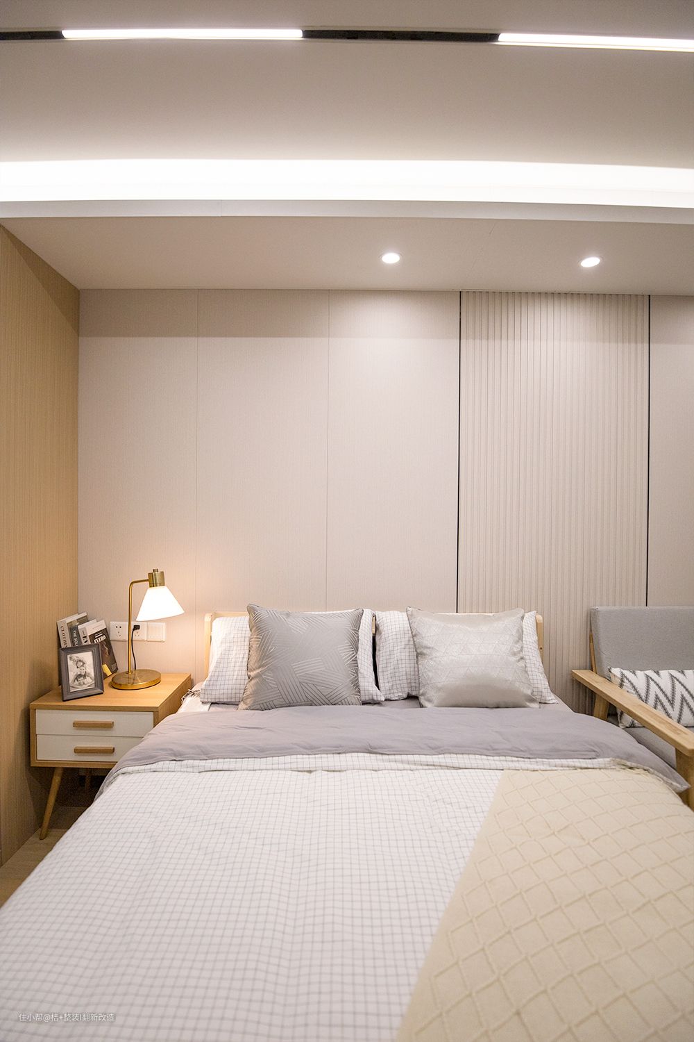流行的木饰面+栅格元素设计即时尚又温馨。奶茶色的家和他们真的太契合了,质感细腻、高级舒适。不管多累,回到家就可以立马被治愈了。主卧背景做的是木饰面格珊拼接,没有多余的色彩,也可以非常吸睛,原木色的床头柜和床架,真的太温柔了。