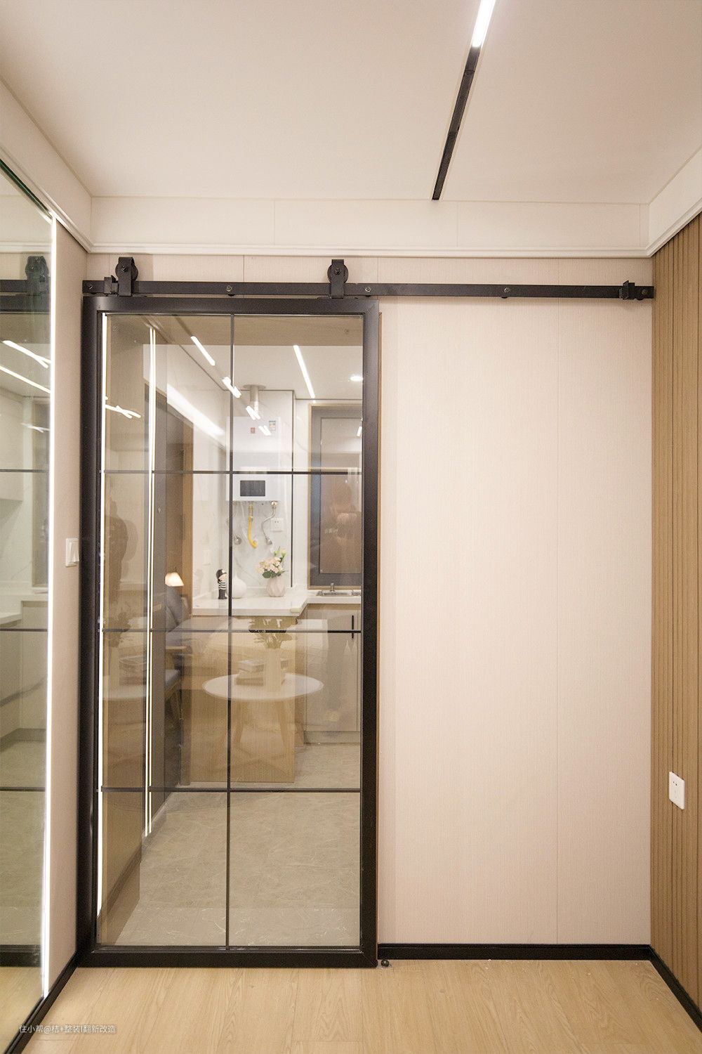 谷仓门旁边一面顶天立地得镜子搭配流线灯带氛围感十足,让空间视觉变大。出门前照照镜子,开启美好的一天。