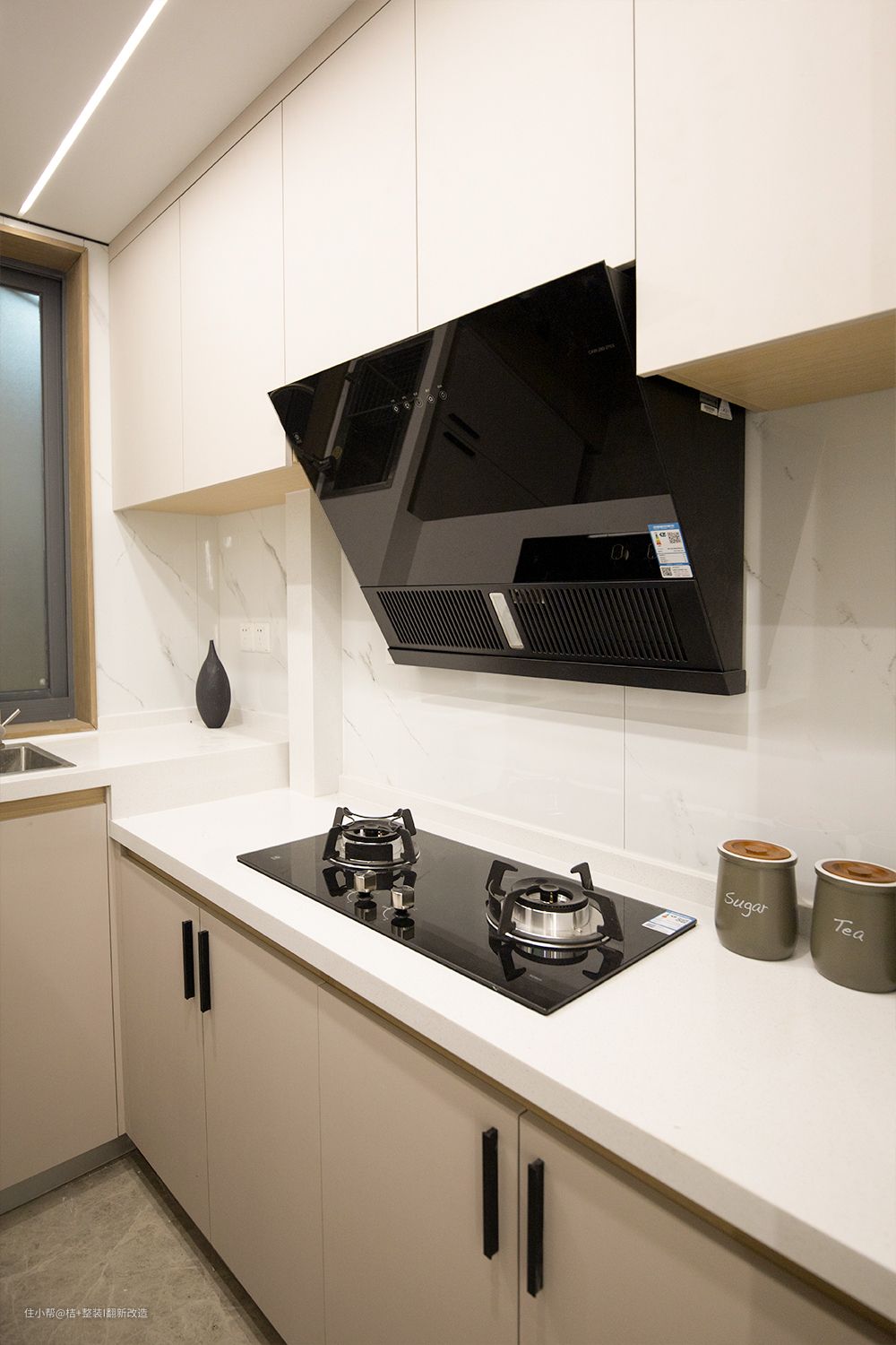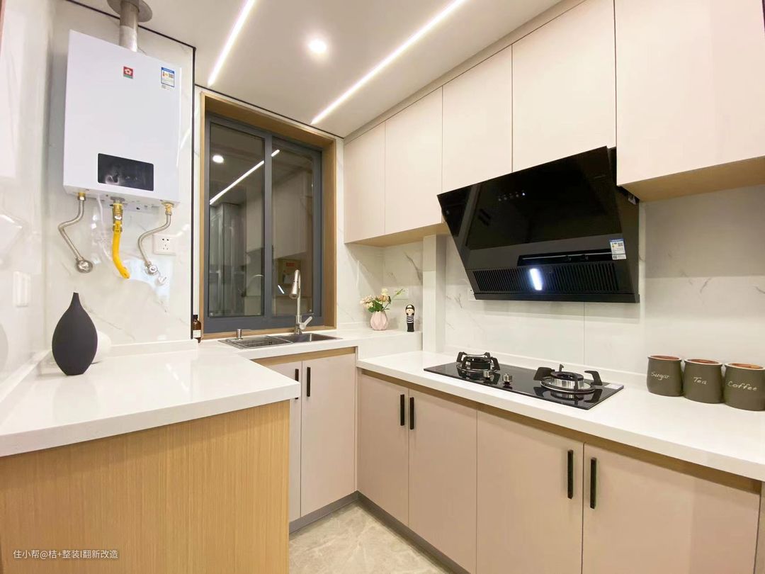 我们看一看28天完工的小房子长什么样子? 走进入户门就是u型的小厨房,全屋无主灯设计,利用线性灯带贯穿全屋,即提升温馨氛围感,也让人无形中跟着光的指引,将视线延伸至远方,让空间更显通透宽敞。原木色温润舒适,自带柔光感。