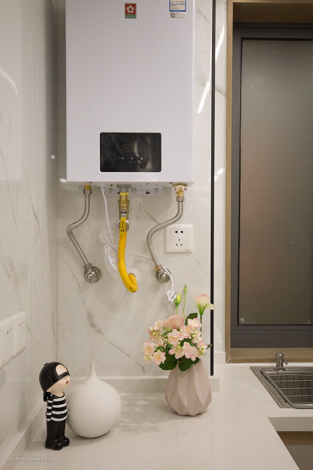 厨房面积本来不大,做推拉门的话有一定的厚度。为了节约厨房内部空间,我们选择了谷仓门。谷仓门的轨道是吊轨无下轨道,方便打扫。用的是长虹玻璃材质,目的是耐脏,厨房偷懒不想收拾台面乱七八糟时,直接关门,长虹玻璃基本隐形里面的杂乱。玻璃材质的质感会让空间更有通透感,让家显得更大。