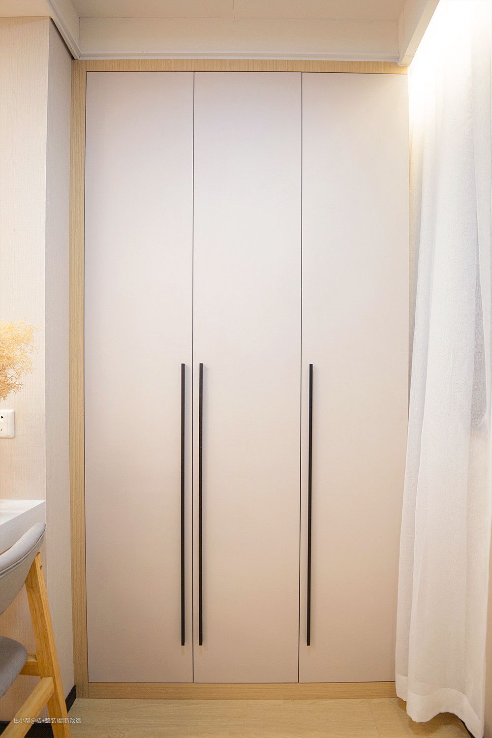 床头柜旁边是顶天立地的衣柜,收纳一个人的衣物完全可以满足。同色系的颜色,原木色搭配白色,干净清爽。