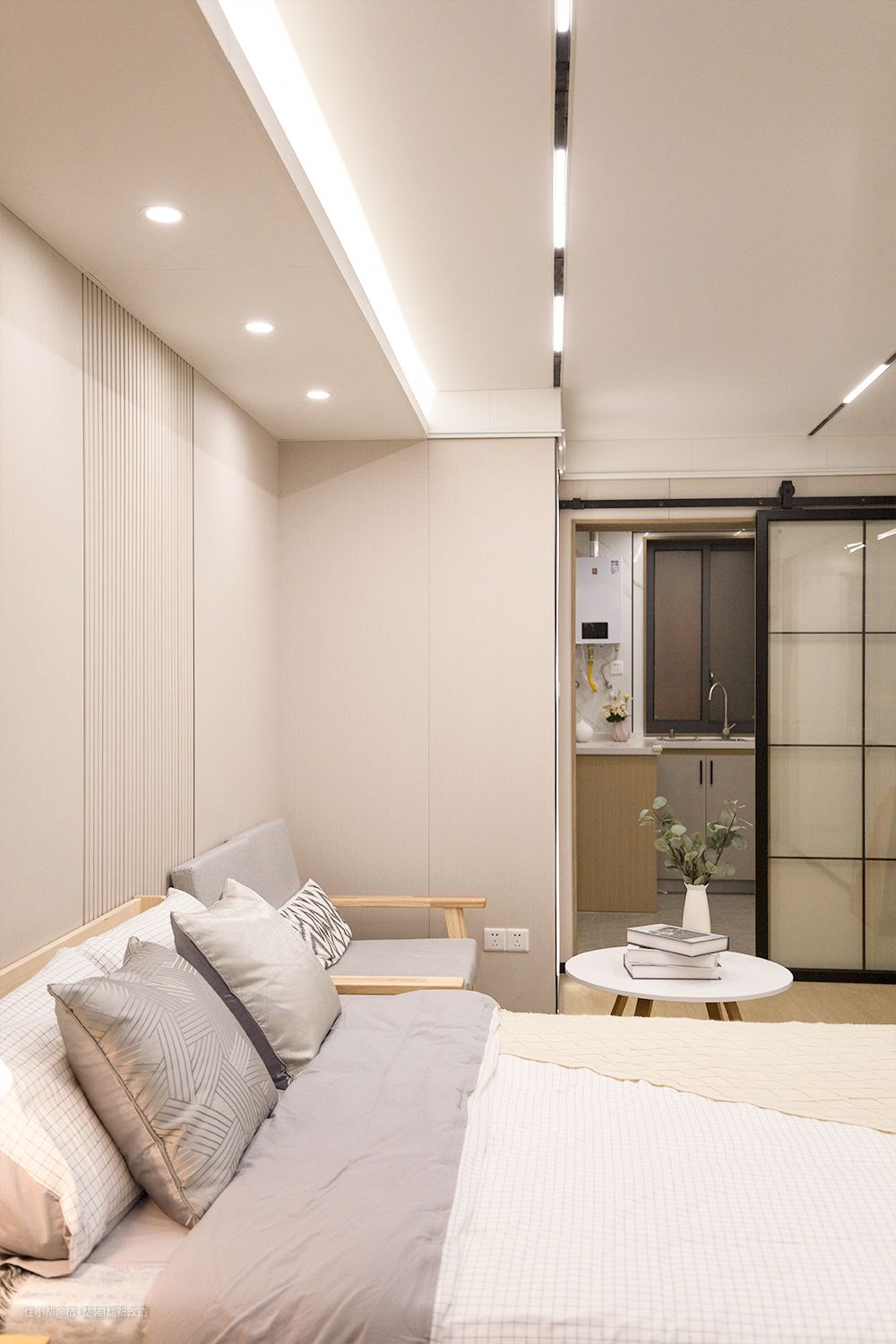 走进来就看到客厅和卧室,全屋延续的是无主灯设计。给大家分享下客厅无主灯,提升视觉空间,不担心吊顶太低会产生压抑感 。 射灯:客厅装三个防眩射灯36°7W/4000k,光线柔和不刺眼而且起到补光防止暗区作用。 磁吸轨道灯选预埋的吊顶前先买回来,吊顶的时候让师傅一起安装,轨道边距50cm,尺寸等于悬浮尺寸左右各扣50cm,左右对称2条轨道协调美观,光源每米轨道配个照明12W泛光灯做基础照明光源,泛光灯中间增加格栅灯聚光防眩照明点缀一下使轨道不那么单调有提升空间整体亮度。磁吸轨道灯光源可以自由搭配随时调整,软装家具入场后光源位置功率亮度必要的可以做适当调整。
