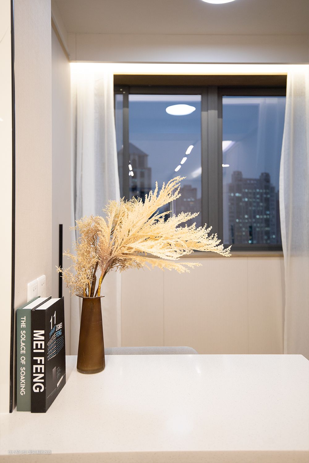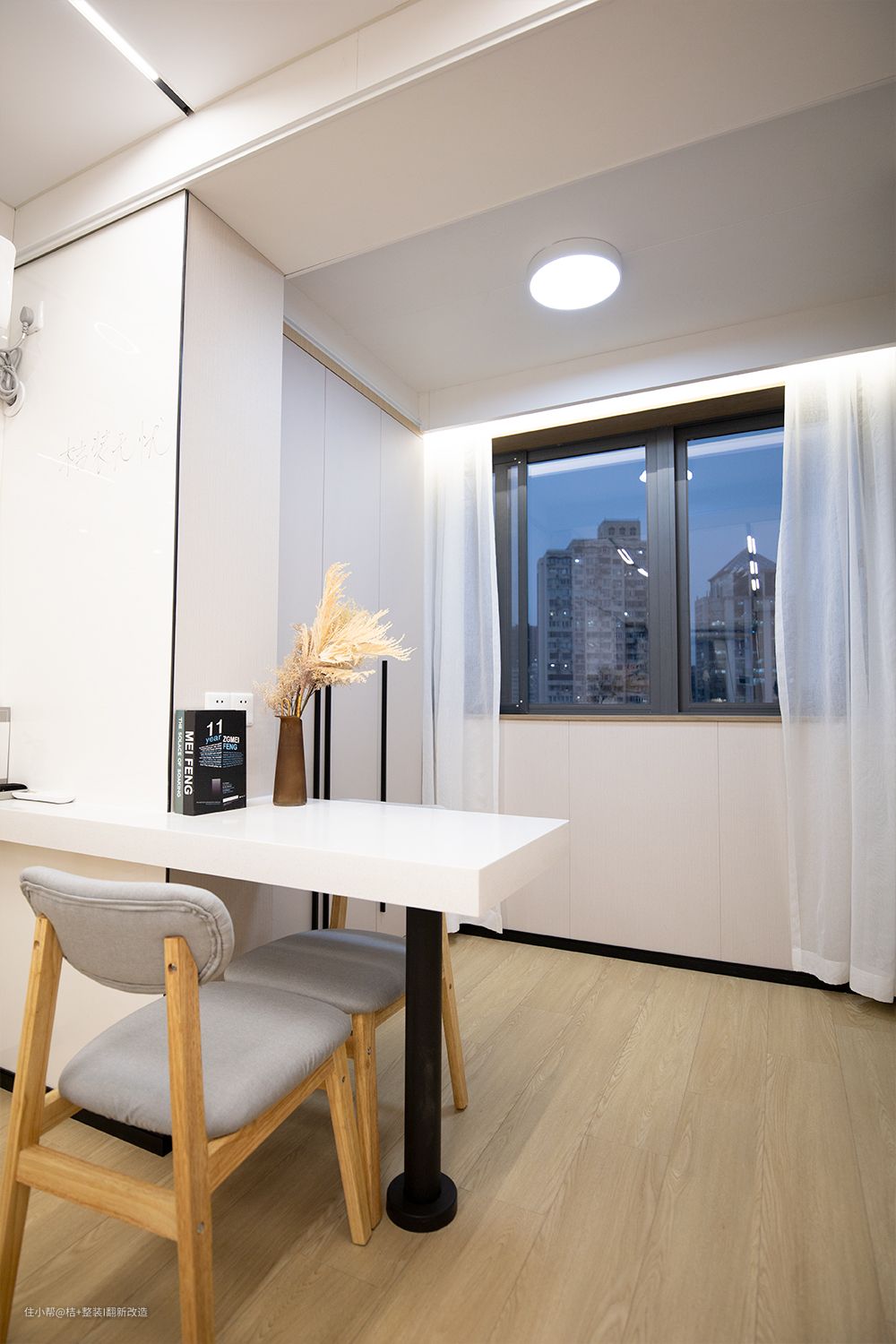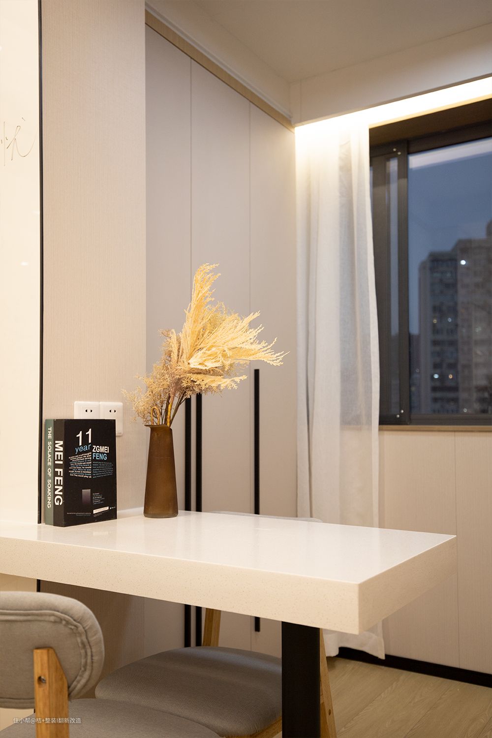 小户型真的每一平方都不能浪费,为了充分利用空间把阳台作为了办公学习区。书桌区域的自然光线很好,整体来说把阳台设计成办公区,我觉得真的挺实用的。工作学习的同时还能舒展身心,累了看看窗外的风景心情也蛮治愈的。
