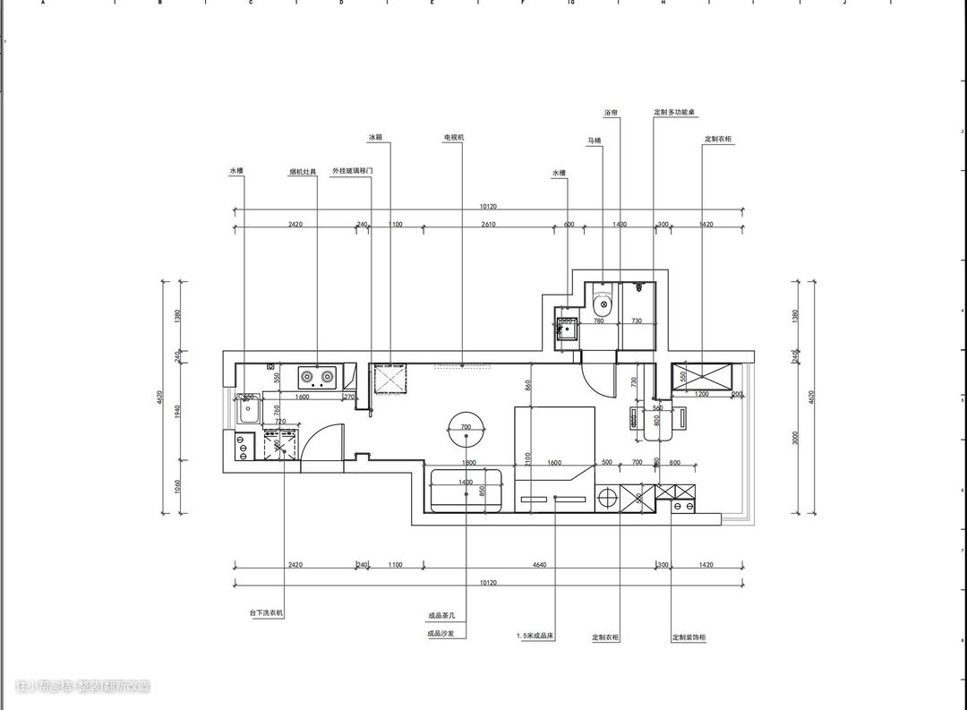 我们设计的首要目标在于满足屋主生活的基本需要以及个人风格喜好。在满足空间功能需求的前提下,运用设计语言,定制屋主独一无二的家。由于这个房子只需要满足一个人的居住需求,所以在保证空间利用率最大化的情况下,把一字型的区域分成厨房功能区,客厅区,卧室区,书房阳台区四个部分。