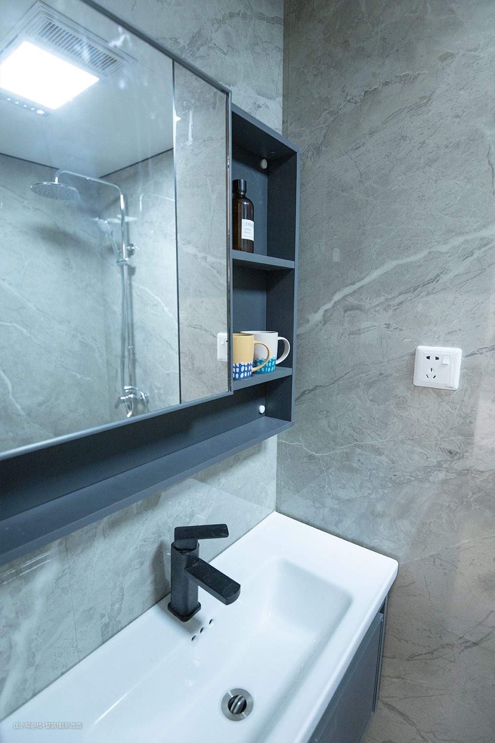卫生间在书桌旁边,推开木门就是卫生间了。整体简约的设计,灰色的浴室柜搭配奶茶色花纹瓷砖。收纳能力一流,镜柜后面又三块地方可以收纳,深度足够们可以放下日常囤货。旁边的开放格放日常用的洗漱用品。