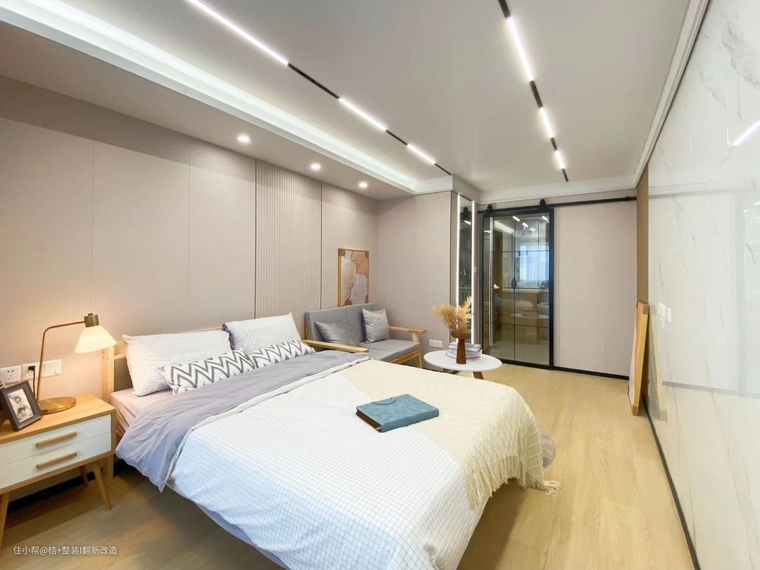 流行的木饰面+栅格元素设计即时尚又温馨。奶茶色的家和他们真的太契合了,质感细腻、高级舒适。不管多累,回到家就可以立马被治愈了。主卧背景做的是木饰面格珊拼接,没有多余的色彩,也可以非常吸睛,原木色的床头柜和床架,真的太温柔了。