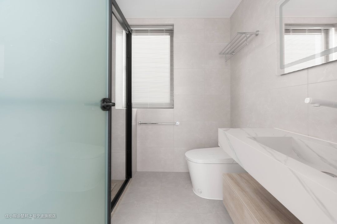 公卫的镜柜改换位置,不再正对小孩房,米色的瓷砖很温柔,被浅白色瓷砖整铺,整个空间显得十分干净明亮。