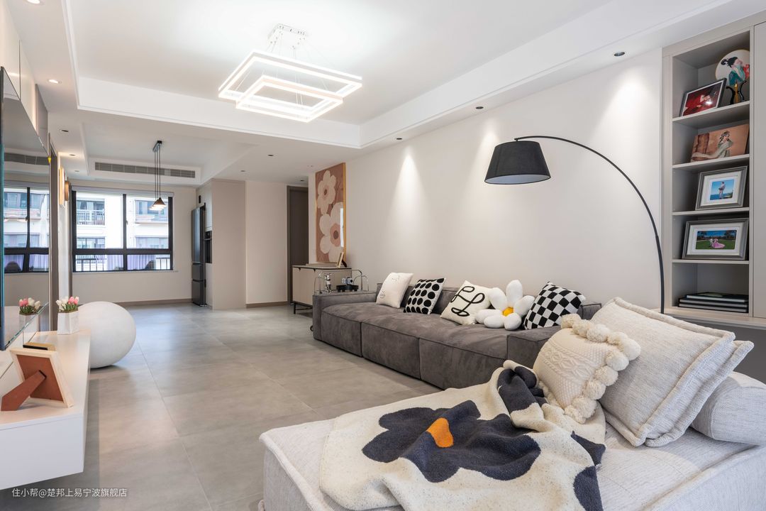 喜欢挤客厅跌级式吊顶搭配几何形状的双层吊灯,打造出极具艺术感的空间,客厅灰色的模块式沙发简约又温馨。