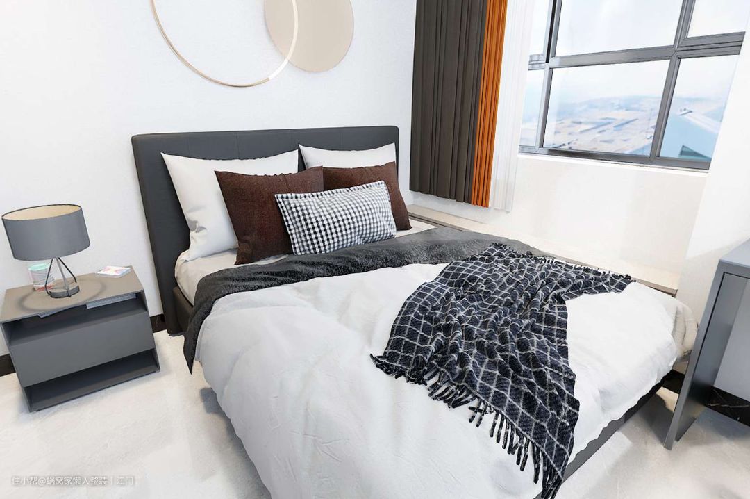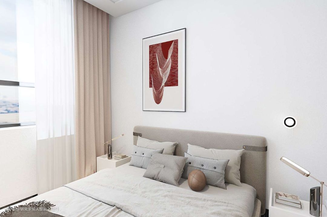 主卧结合了屋主的爱好与需求,整面墙的到顶衣柜将女主人宝贝的衣物安然存放,男主人的收藏品也可以放在开放的格子储物柜里,色调也是以舒适自然为主,与主卧的风格保持一致。床头安装两盏小筒灯,打下的光恰好落在装饰画上,高雅韵味在室内缓缓散开,光线柔和不刺眼,躺在床上也不会被光线直射,这都是设计师的精心安排。