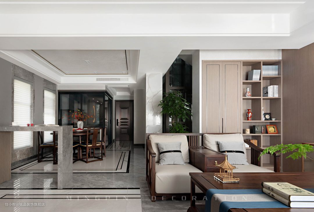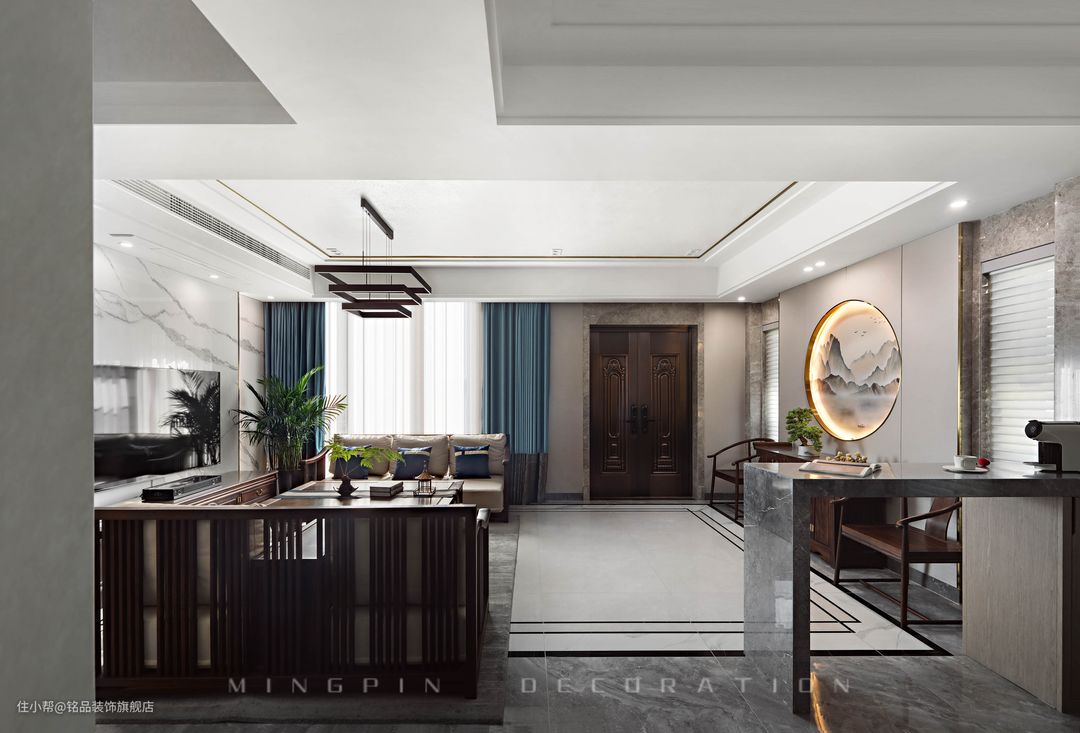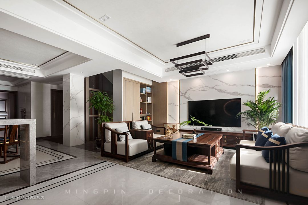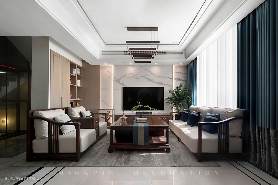 在设计之初,业主的要求室内装饰,要跟室外的建筑尽可能的统一,不要有太大的冲突,室外本身建筑采用的江南建筑一种中式手法,所以室内我们去繁就简,采用的现在新中式的基调,贯穿整个设计。#客厅 #电视背景墙 #沙发