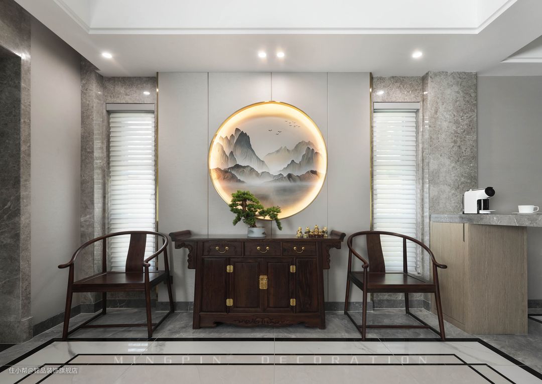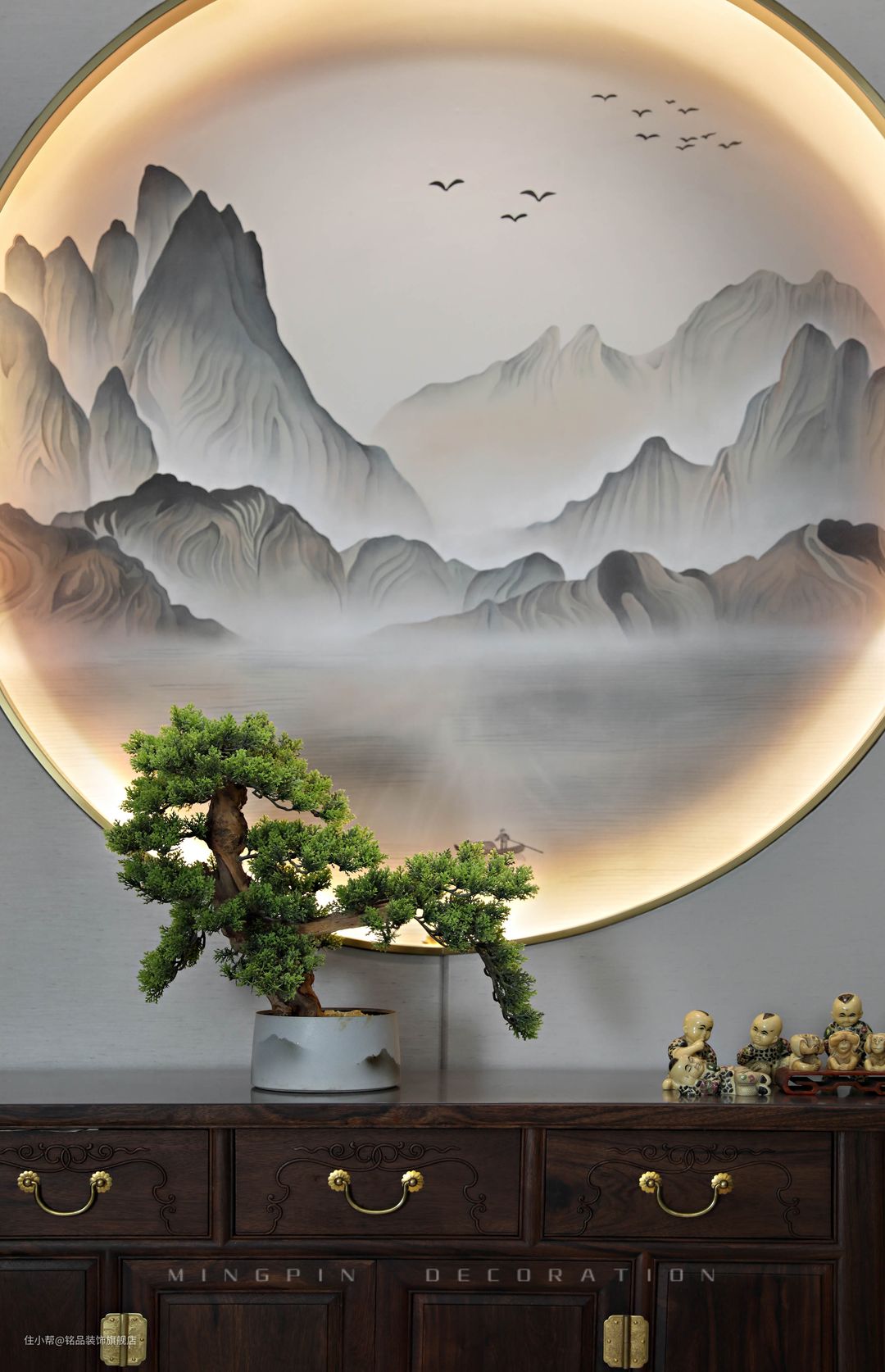 会客区的设计用了对称的美学,两把单人椅,一张中式边桌,背景墙上的中式山水画,迎客松盆栽,每一处都充满着中式元素。#中式 #背景墙 #座椅