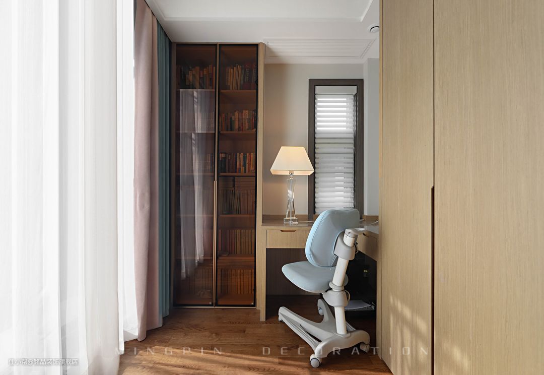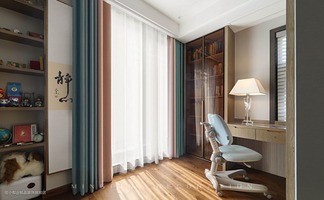 书桌和储物柜的一体式的设计,书桌做了无桌脚的设计,给腿部留出更多空间,座椅搭配了可调节的,可以保护孩子的脊椎。一侧定制了玻璃展示柜,里面用来摆放书籍,还有防尘的效果。#书房 #书桌 #收纳