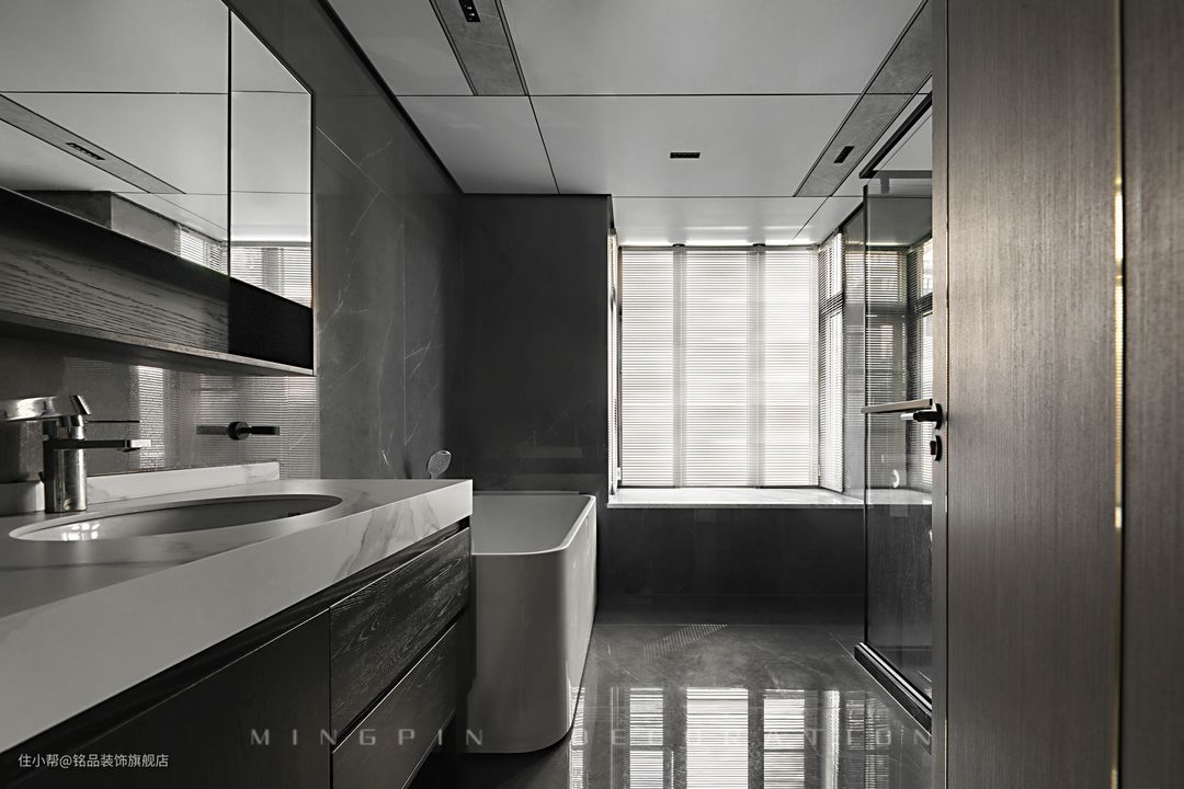 把每一寸空间利用好,把每一处设计做到极致的精细化。将台盆区域浴缸呈一字型设计在同一侧,淋浴区与马桶区在对侧,利用视觉“欺骗手法”,让空间看上去不仅更干净清爽,无形中还能达到大一倍的效果。#卫生间 #干湿分离 #浴缸