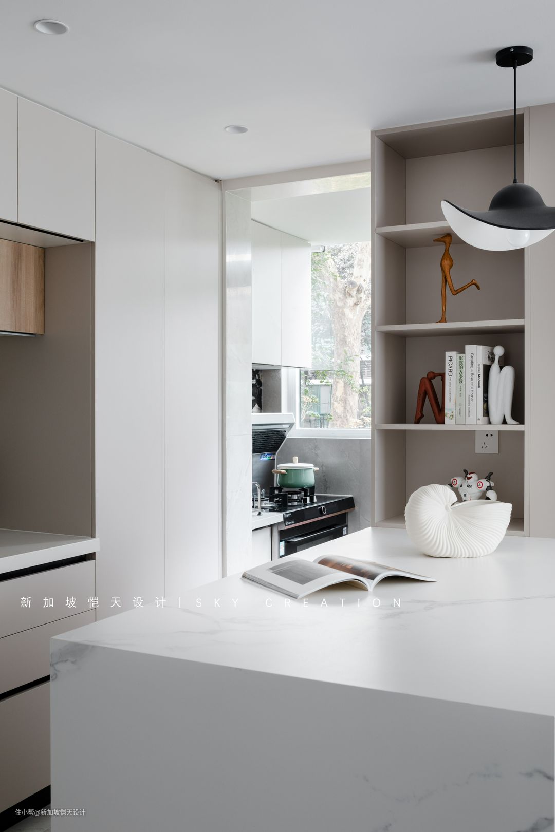 中西厨分区,并将炒菜区布置在阳台,提高空间利用率的同时,也尽可能地降低了开放式厨房带来的油烟问题。