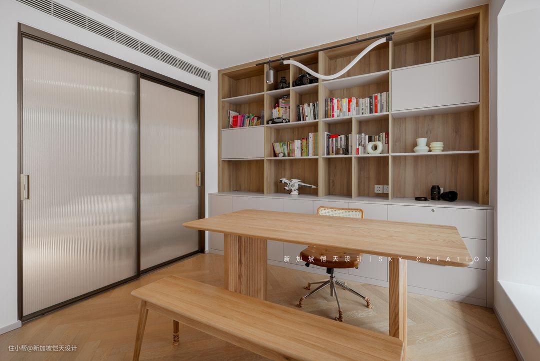 业主一家人都喜欢读书,家里的藏书也很多,布置了整面书墙,也能从小培养两个孩子的阅读兴趣。 这里既是业主办公、亲子阅读空间,又是自我放松的空间。 书房临近大面积天井,自然采光很不错,结合主卧大面积长虹玻璃推拉门,大大增加了空间的开阔感。