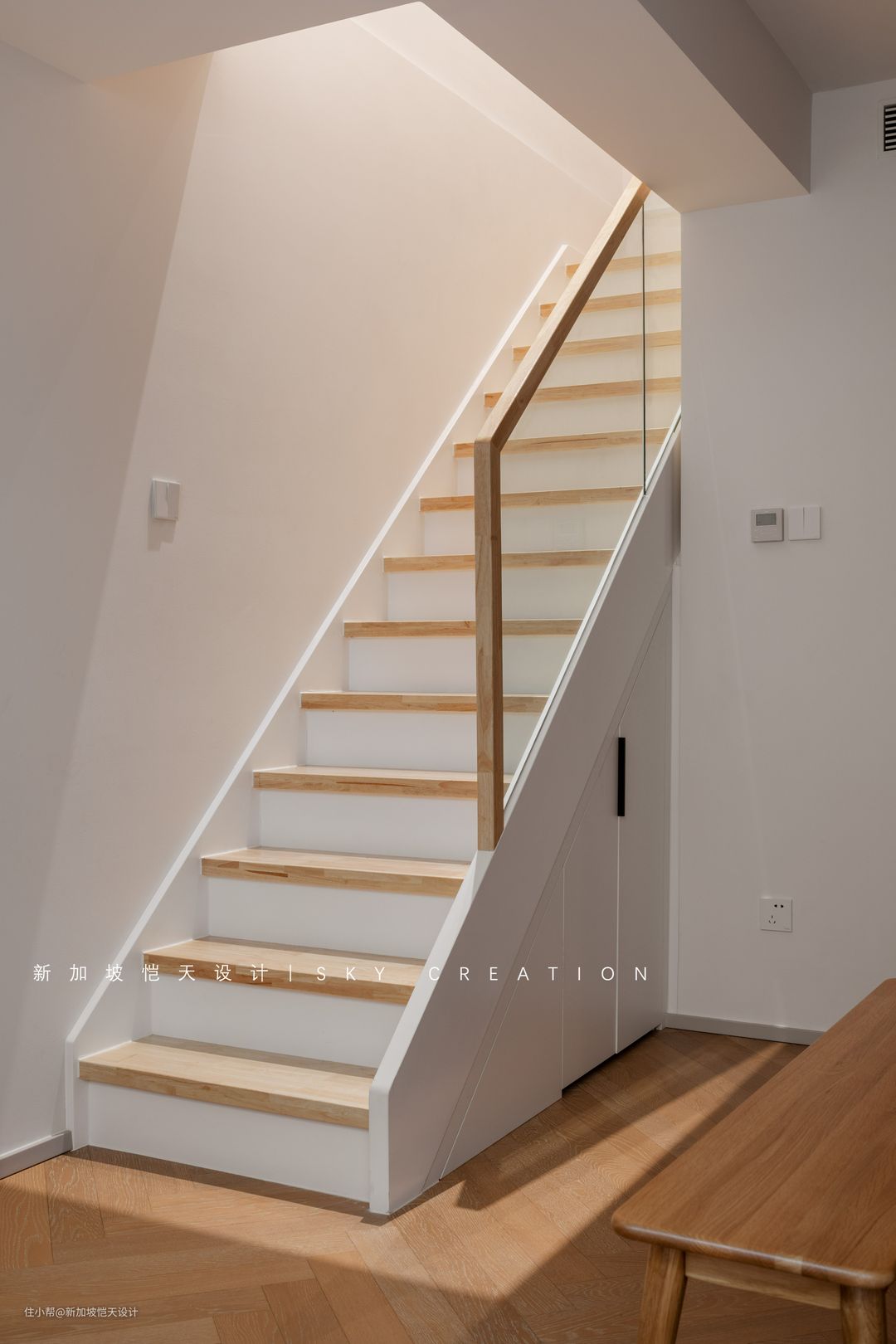 玻璃栏杆增强了通透性,消除楼梯空间狭窄的视觉感受,也让原本采光不佳的楼梯得到自然光线补充。 楼梯下方也没有浪费,设计了实用的收纳区。