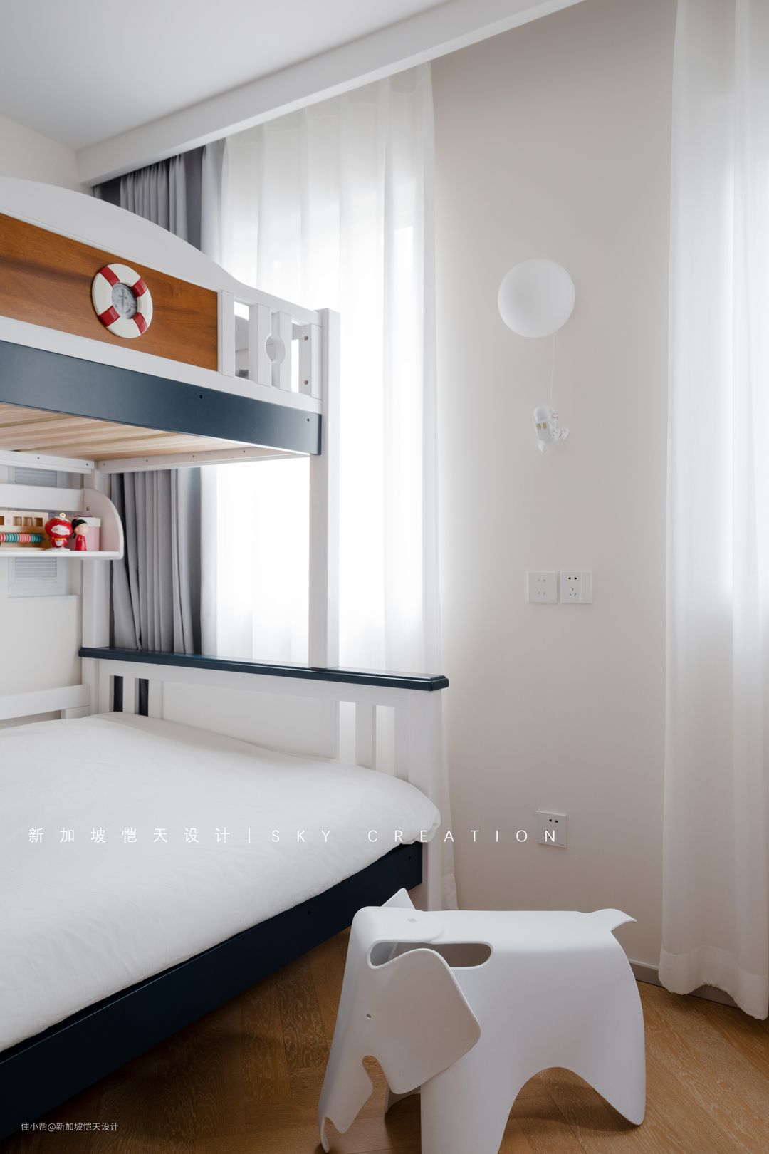 儿童房里,无论宇宙蓝的点缀,还是宇航员壁灯、大象椅的加入,都遵循了儿童的心理喜好,轻松且童趣。