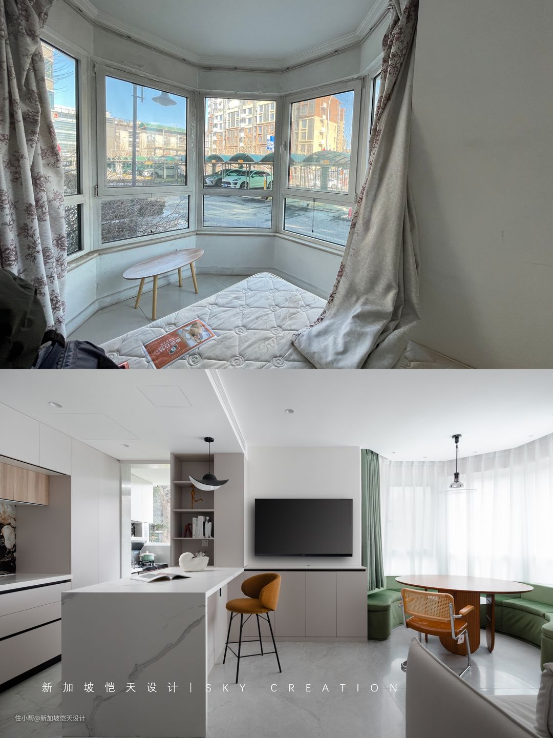 为了缩短动线、拥有更好的视线,将客厅与原带弧形窗的卧室位置进行了对调。 另一侧,将厨房打开,打破墙体带来的空间界限之后,布置LDK一体式设计,这也是当下年轻人最喜欢的互动模式,彼此独立又相互扩展。