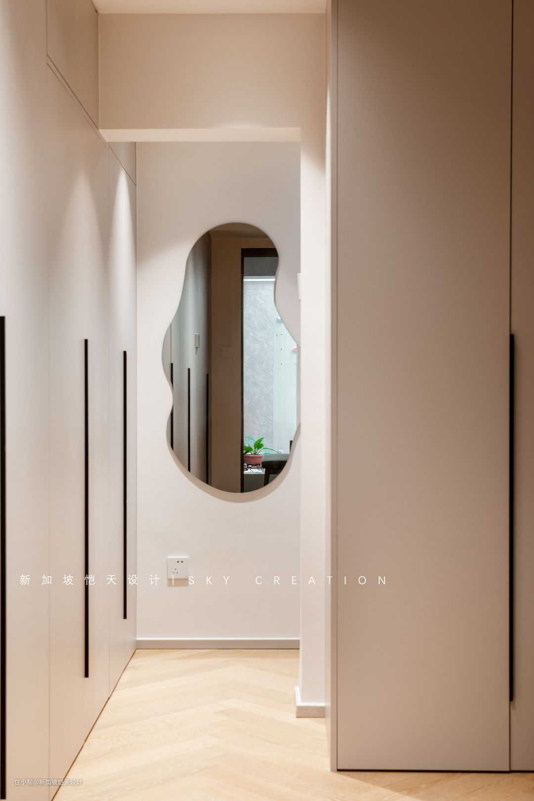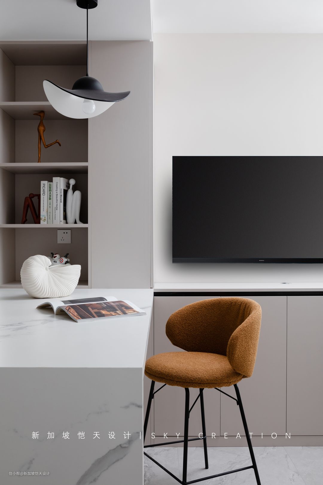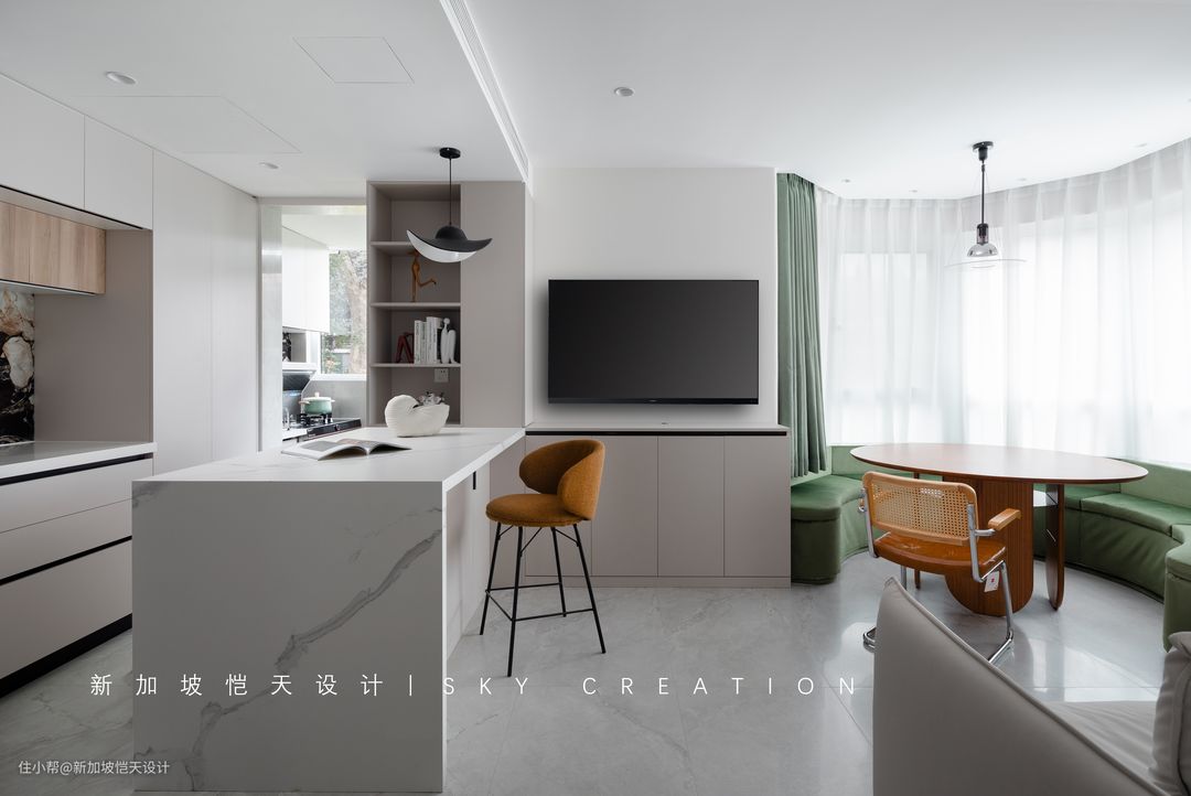摒弃常见电视柜,临近厨房做了一个进深300mm的薄款电视柜,满足收纳需求的同时,也不影响整体的开阔感。