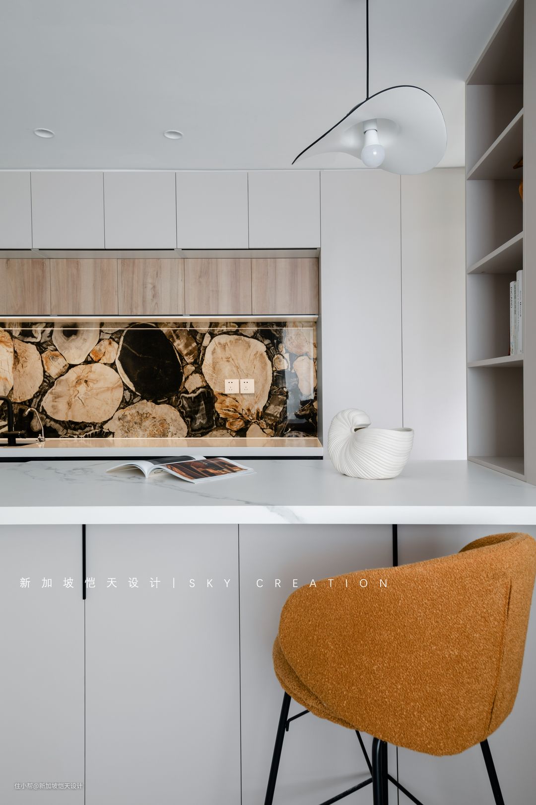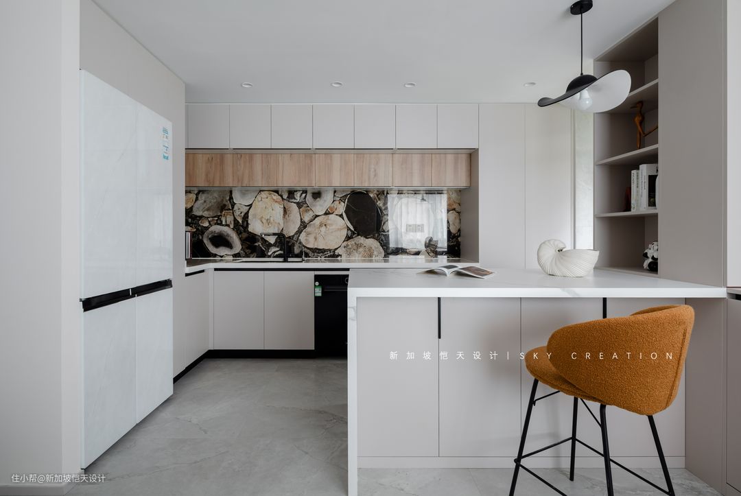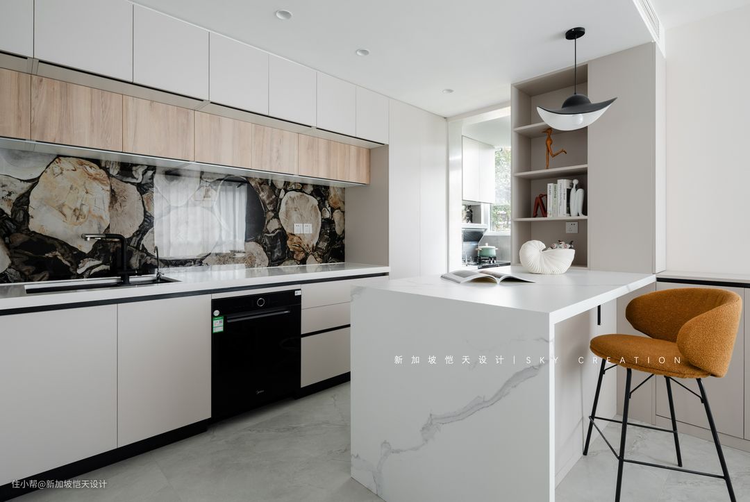 大面积浅色系,难免是显得索然无味,奢石墙砖、大理石、原木等多元素的呈现,整体更沉稳大气,视觉感也更加丰富。