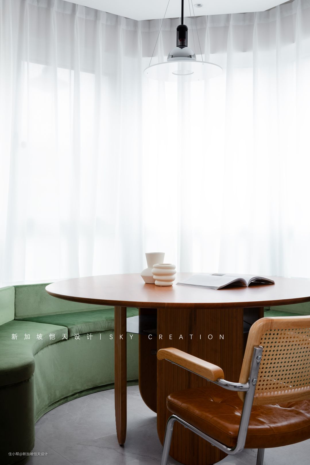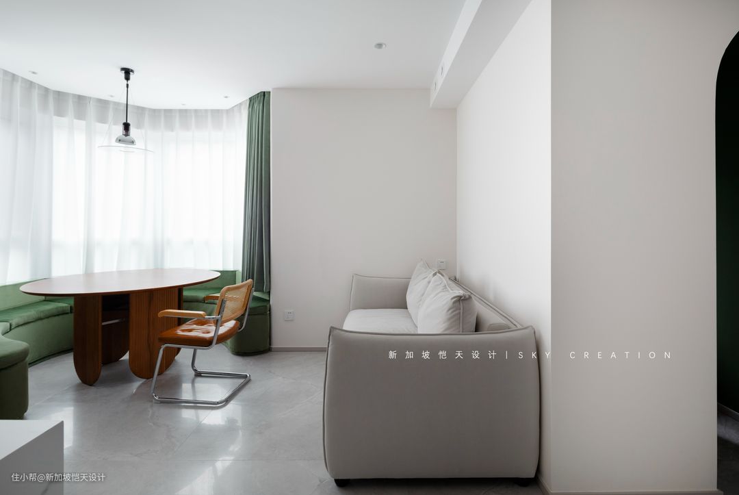 餐厅临弧形落地窗而设,并顺势做了U形卡座式沙发,最大化利用空间、节省空间,也可容纳更多亲友同时用餐。 非用餐时段,餐厅则随时承载阅读和轻办公的功能。亲友小聚,喝茶、聊天,也具备了更灵活、更围合的互动空间。