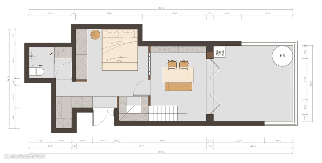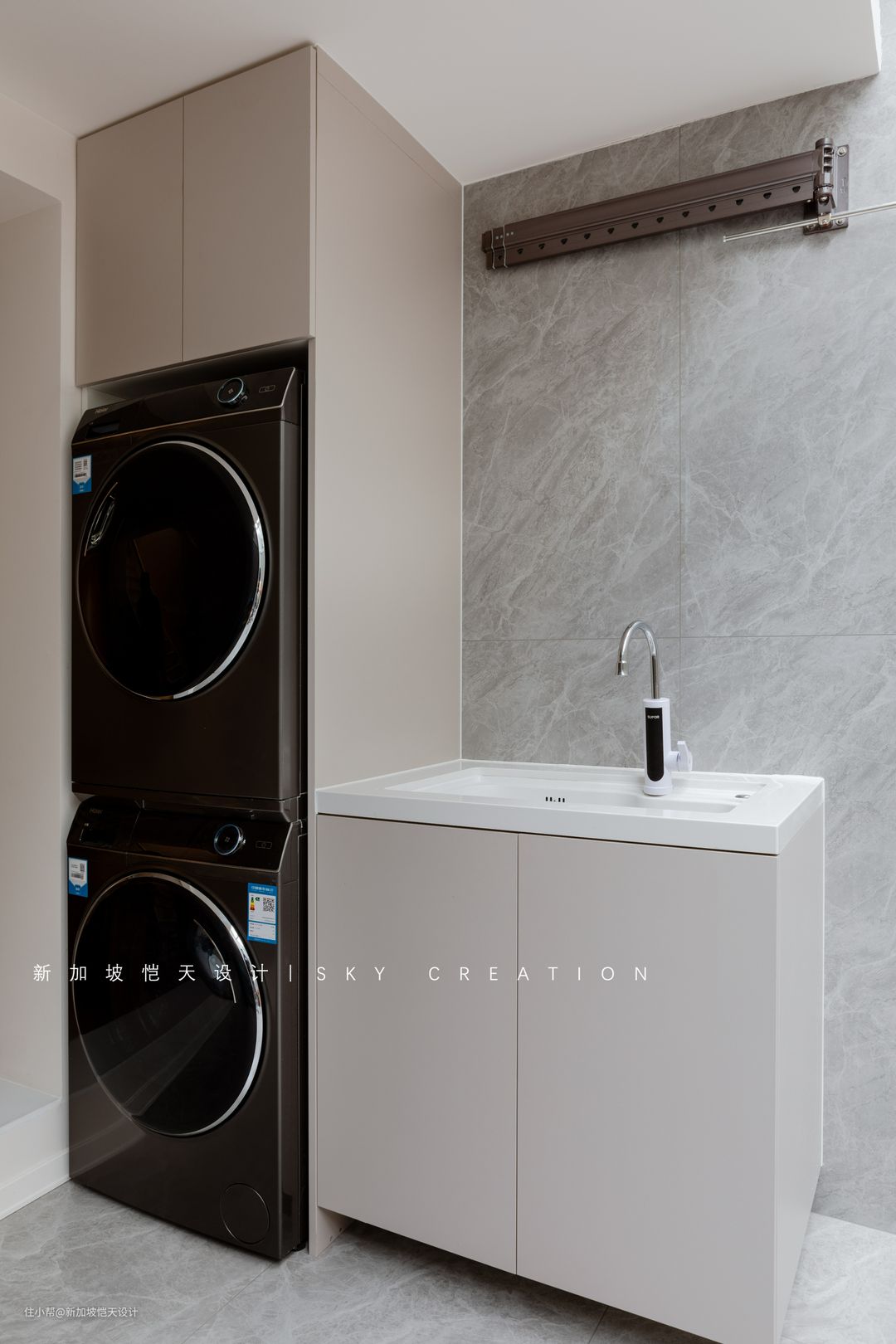 洗衣区布置在了天井的一角,并布置了折叠晾衣架,晾晒衣物更加方便,平时不使用时也可直接收起来,不占用空间。