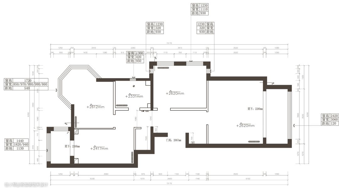 ▲改造前这里是卧室空间 原始布局,客餐厅与厨房相隔较远。与厨房相邻的卧室,由于空间有限且自带弧形窗,空间利用率较低。