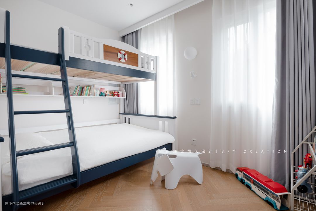 儿童房仅8㎡左右,上下床,解决了二胎家庭生活空间的局促。宇宙蓝+白色的运用,给两个男孩营造出温馨有趣的童年氛围。 错落有致的上下床设计不显压抑,给足这里足够的呼吸感,满足两个小朋友阅读、娱乐、睡眠三合一需求。