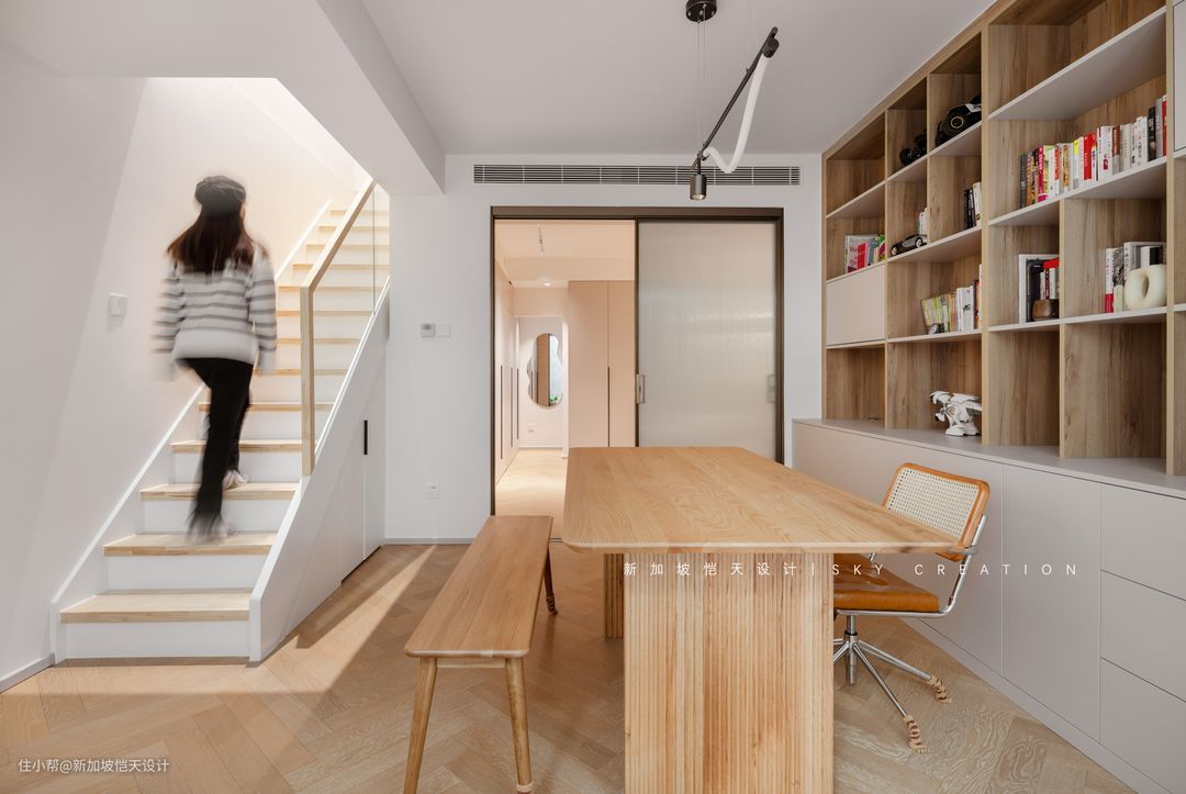 玻璃栏杆增强了通透性,消除楼梯空间狭窄的视觉感受,也让原本采光不佳的楼梯得到自然光线补充。 楼梯下方也没有浪费,设计了实用的收纳区。