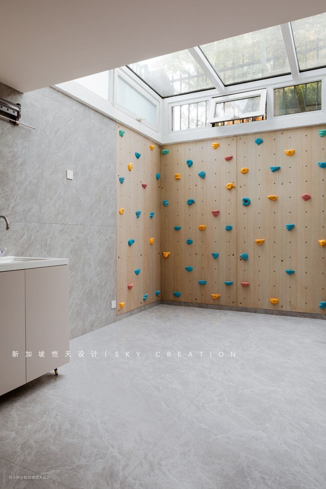 天井处特意打造了一个个性十足的攀岩区,迎合两个孩子活泼好动的天性。