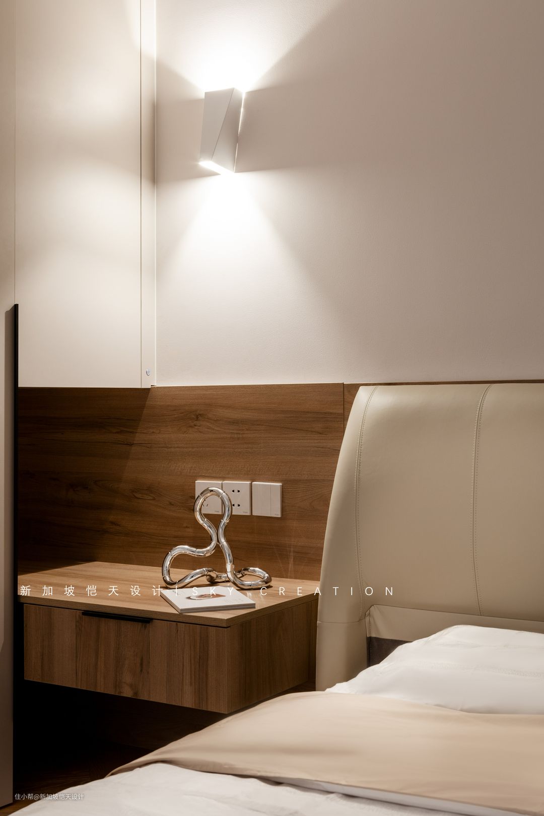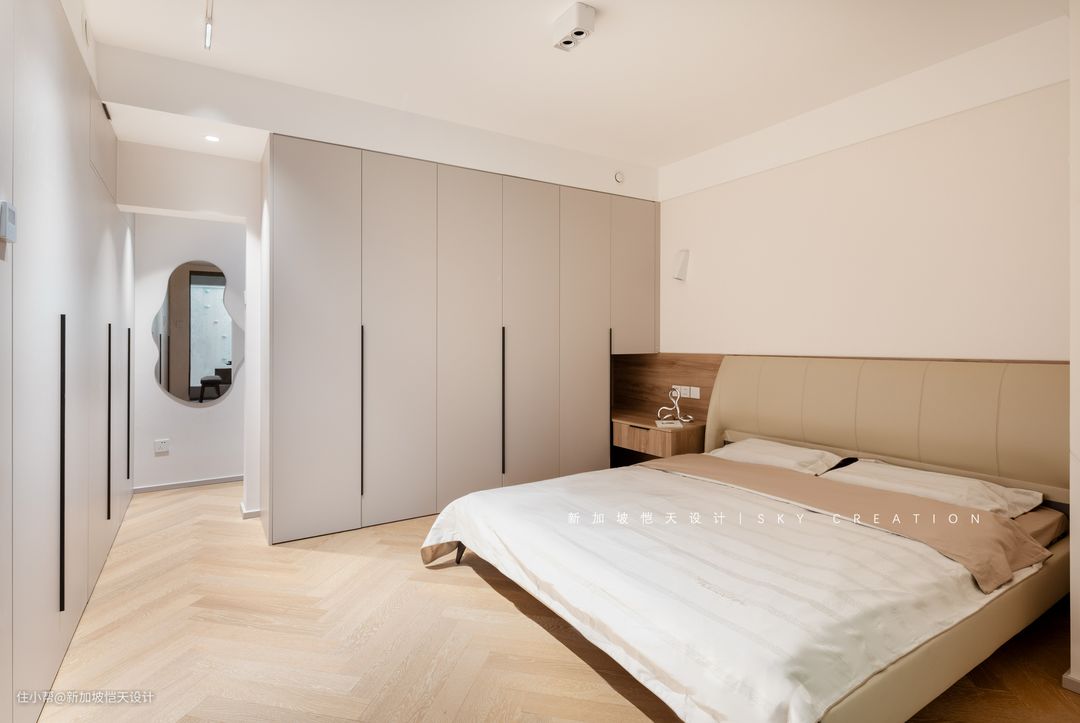 通往地下室的防盗门,也被“藏”进了收纳柜里,晚上两人也可直接从这里回家,避免打扰老人和孩子休息。 一体式床头柜和衣柜的设计,让柜门开关闭合更加便捷,兼顾颜值、实用性及开阔性。