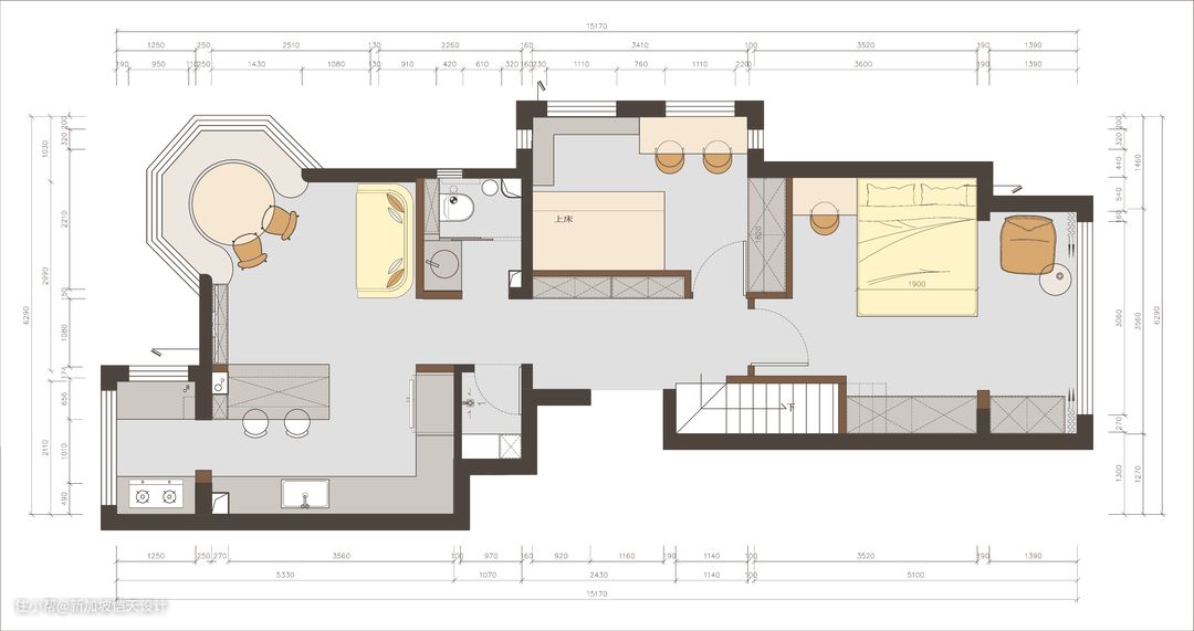 ▲一层 改造后平面布置图 ○ 一层改造重点: 1. 改变儿童房门洞位置,进门增设通体鞋柜。 2. 将原带弧形阳台卧室改为客餐厅,并将厨房打开。 3. 进门左右两侧暗室,分别改为淋浴房和楼梯间。 4. 布置三分离卫生间,日常使用更加高效便捷。