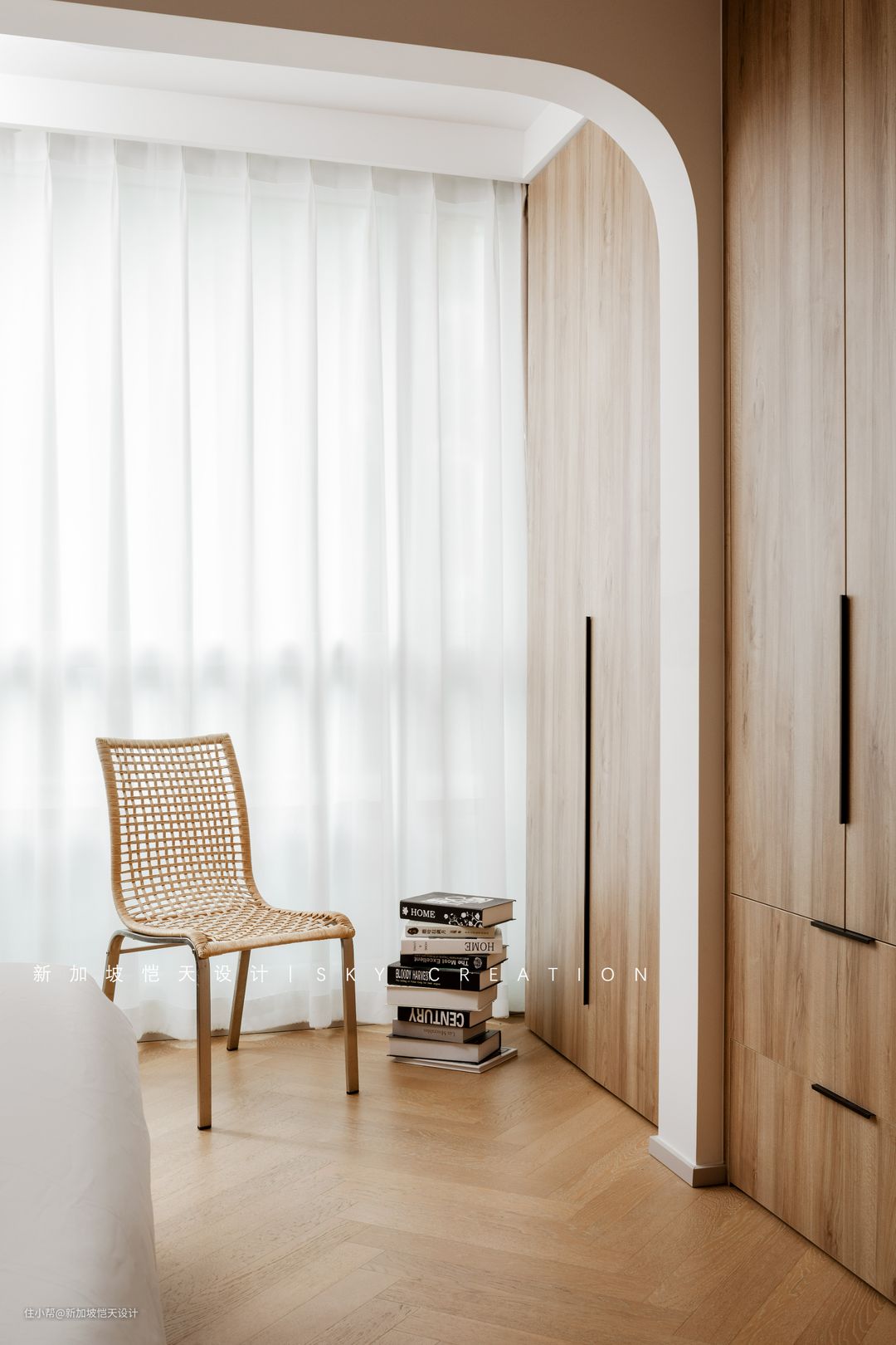 将一层带阳台的卧室留作了父母房,整体以白色和原木色为基调,温馨舒适。收纳柜由室内延伸至阳台,补充收纳空间,空间也更具延伸性和整体感。 阳台做了弧形门洞设计,也给这里增添一丝柔美感与结构感。