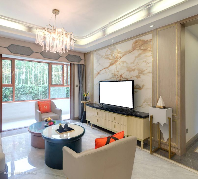 电视背景墙选择了大理石叠加上了木饰面板的设计,大理石上的纹路能够丰富视觉上的饱满,而金属质感的线条能够增加视觉上的层次感。电视柜两侧的个性化家具充当展示台,时尚美观。电视柜选择了带有四角支撑的,更方便了日常的清洁打扫。
