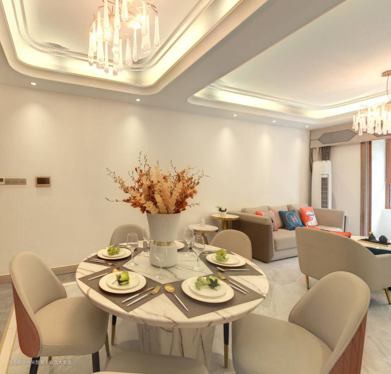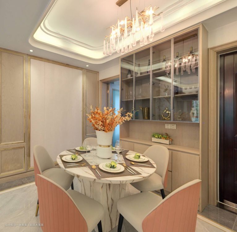 餐厅的餐桌选择了圆桌样式的,圆形能够聚拢人气,将一家人拉拢到一起,圆形餐桌形如满月,象征一家老少团圆,亲密无间,大家围坐在一起不分彼此,气氛融洽而且聚扰人气,能够很好地烘托进食的气氛。