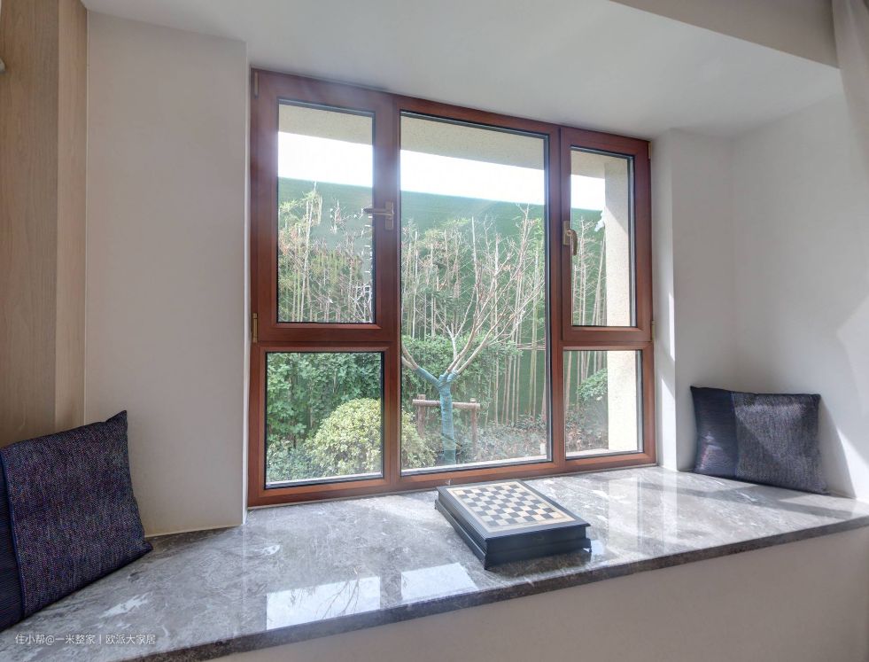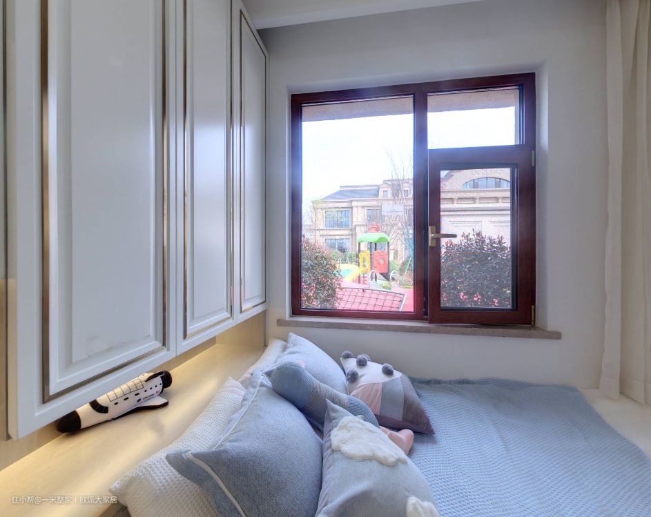 卧室里做了飘窗的设计,不但可以享受充足的室内光线,还可以扩大室内视野,饱览室外秀美景观,主卧的飘窗更注重体现温馨宁静。飘窗还是一个很不错的观景台,躺在窗台上,上面放上两个靠垫,或坐或卧,白天看车水马龙,晚上看满天星斗。