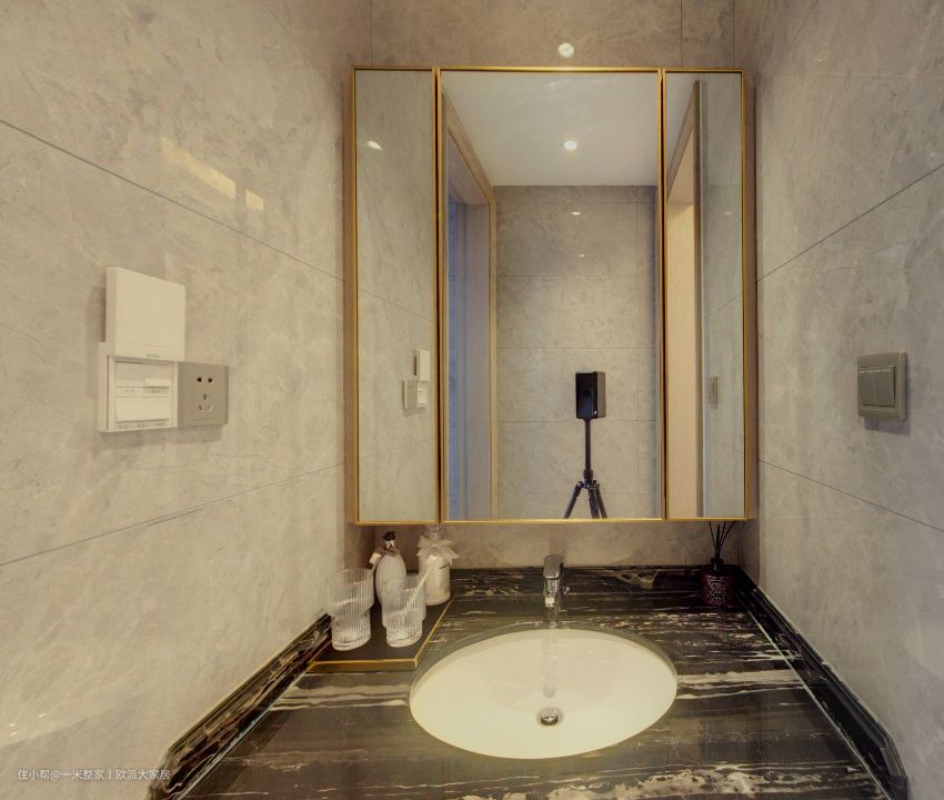洗漱台上面的镜子选择了镜柜样式的,可以扩容洗漱区的收纳空间,可以充分利用镜柜来收纳洗漱用品,让浴室柜台面变得整洁,不再凌乱。