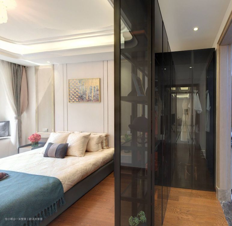 卧室里面还做了一个小型的衣帽间,L型的玻璃透明衣柜,既起到了隔断的作用,又能充当展示。透明玻璃衣柜,时尚美观,还能清楚衣服的摆放,节省了翻找的时间。