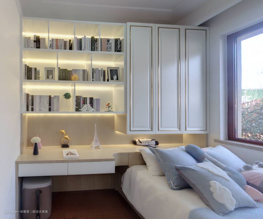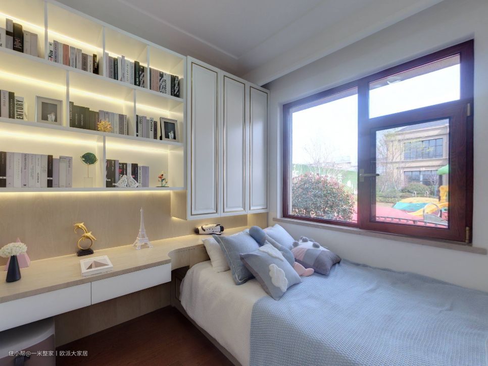 儿童房的书桌是做了多功能的设计,开放式柜子是能够用来对书籍的收纳摆放,封闭式的则可以用来摆放衣物,节省了房间的空间。