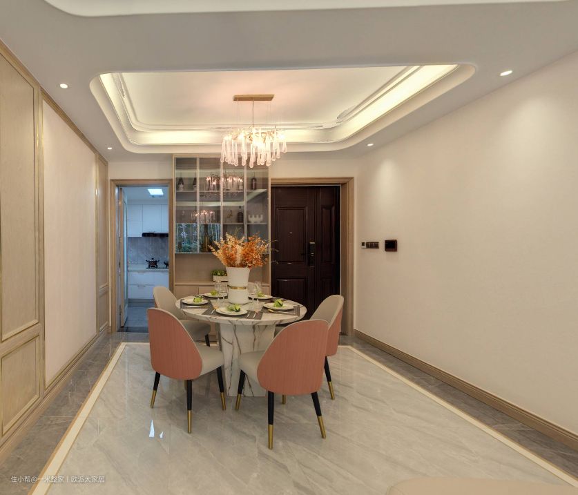 餐厅和客厅是连接在一起的,通过过道和两个吊顶来将两个空间划分开来,让整体的空间感更加的好,同时每个区域又能够很明确。餐厅的灯具风格和客厅相同,流苏样式的水晶灯起到了点缀的作用,这样的设计可以维护视觉的统一。