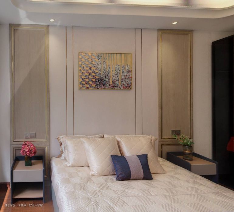 床头背景墙是由米色的木饰面板和原木色的木饰面板拼接组成的,床头两侧床头柜和绿植相互对称,搭配上墙面上的金属质感的线条,丰富了视觉的层次感。装饰画在整体的设计中起到了点缀的作用。