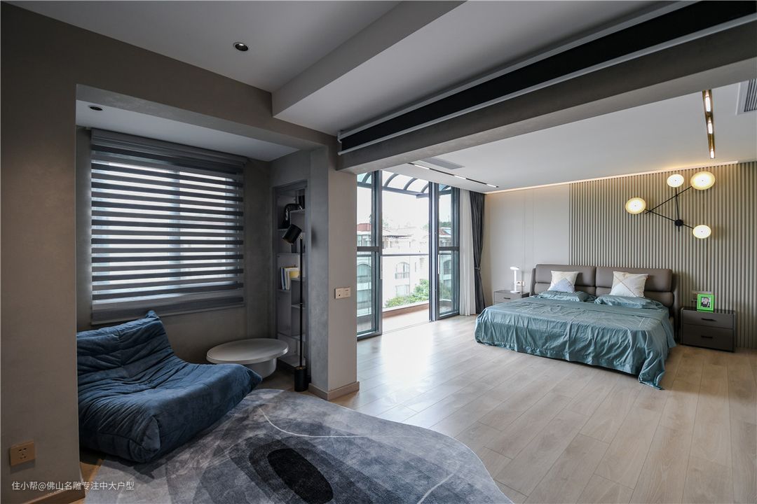 而另一卧室讲究阅读空间,在进门区域增加墙体围合,构造出一隅,百叶窗遮盖上窗,放置沙发椅,一侧墙体内嵌书架,几何错落设计感之余,不占空间。