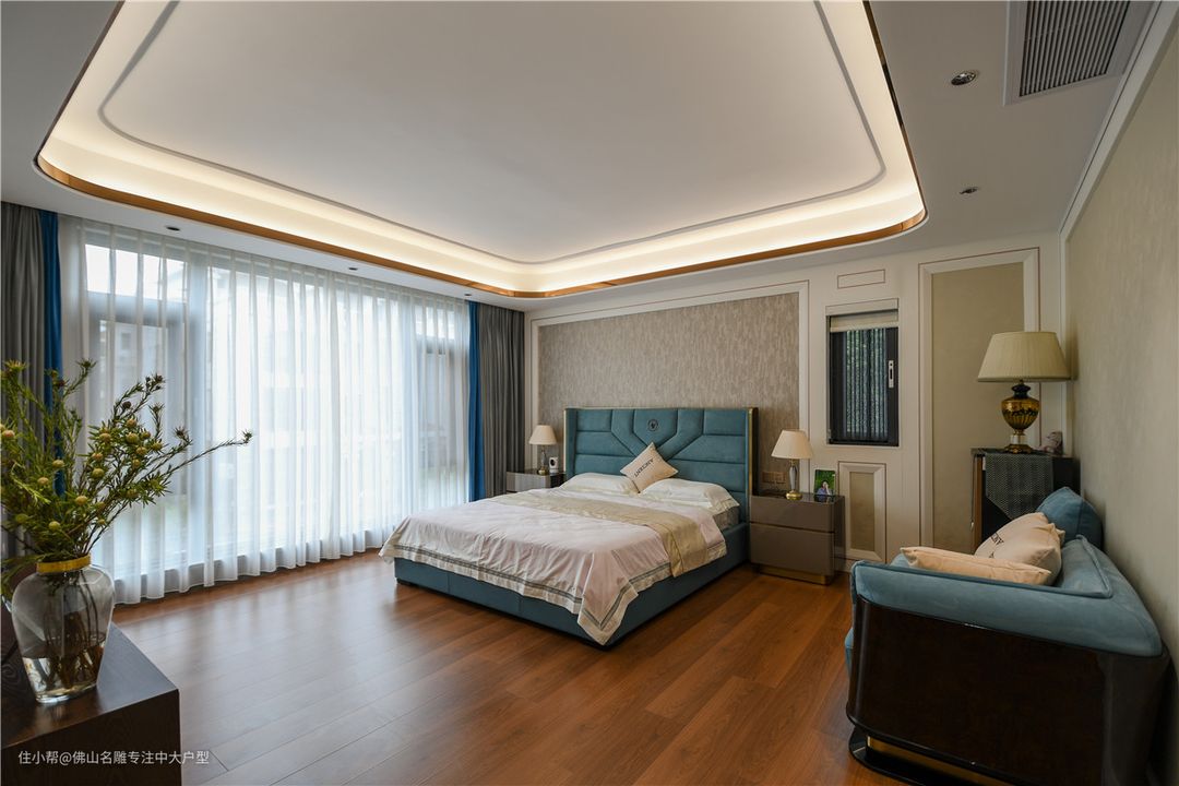 宽阔尺度的精妙在于场区自由度,可以开放互动,又可以在细节处对内变化独立。餐厨间是三联动推门,隔绝油烟,开闭间可以在家庭聚会和私享烹饪时光随意切换。米色+蓝色皮质沙发,与客厅呈现遥想呼应感觉。