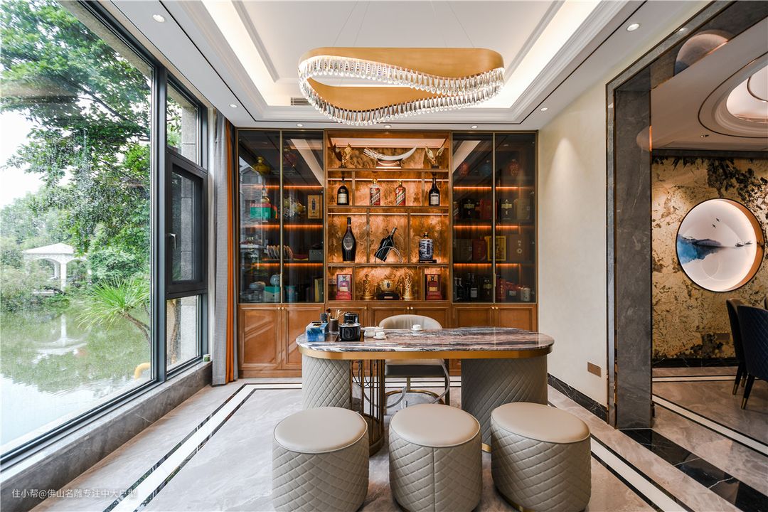 从餐厅移步,旁边则是茶室,串联客餐厅的互动氛围,茶室设在此处是最优解。考虑主人喝茶爱好以及需要休闲空间,大大落地窗伴随茶香缱倦,偷得半日闲。一方面是茶室,一方面亦作会客使用,多元化功能,身后还是储物展示墙,满满奢雅贵气。