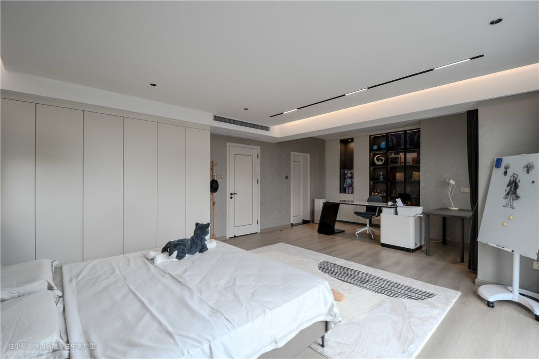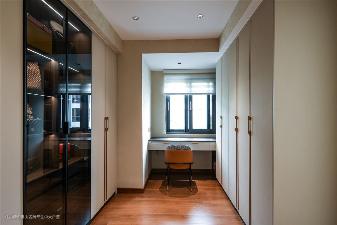视线转换背景墙后,是给主人的衣帽间,衣柜搭配墙面同色,玻璃柜间隔,衣物拿取变得游刃有余,而面向采光处设置梳妆台给予女主人使用。