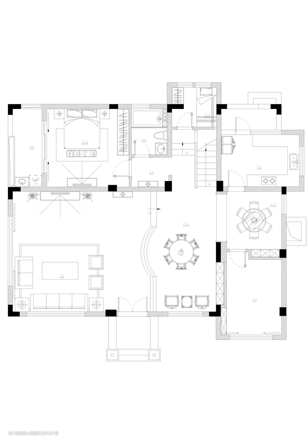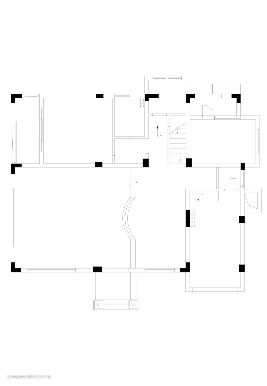 原始结构: 1、比起结构拆除调整,我们更希望对细节进行划分; 2、厨房面积大,占据多余空间,操作单一; 3、主客厅区位置不变,但区间相互没有明显定位,做不到开放独立形式。 设计理念: 360㎡别墅尺度自由,丰富的功能区将所有成员的生活喜好容纳入内,但原有结构规划不够明晰,设计师调整入户的空间,让原本不规则的空间,增加一个储物间的同时大大提升客厅的尺度,巧妙的把厨房及餐厅连接在一起,做到随时可开合的空间,提升两个空间的尺度同时,也增加了空间的采光及通风,运用天然奢石及实木贴皮烤漆护墙板,结合纤细的玫瑰金条提升空间层次。